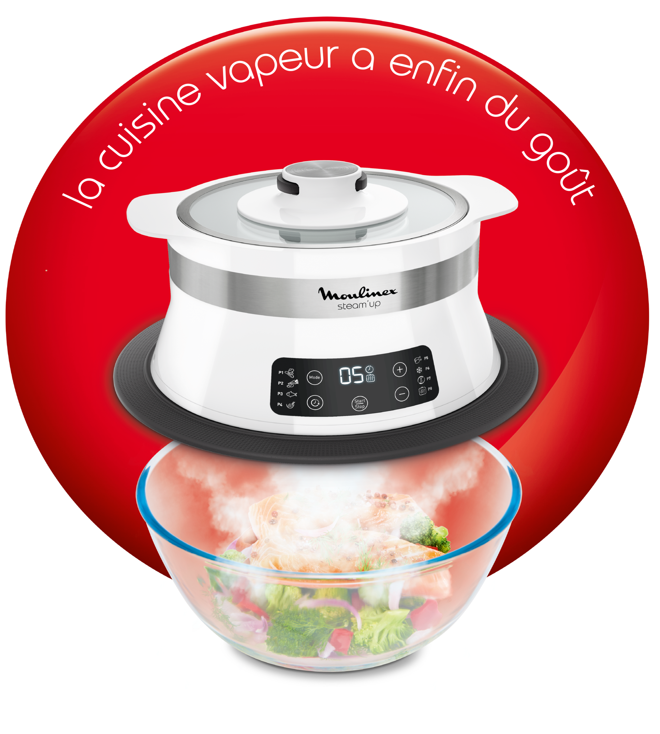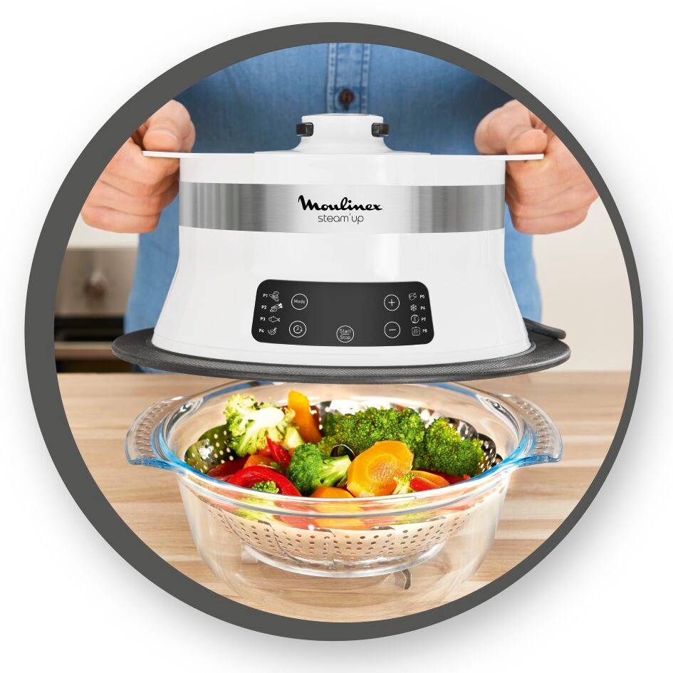La vapeur sous toutes ses saveurs ! La technologie innovante du cuiseur vapeur Steam'up fait descendre la vapeur directement dans vos récipients, mariant sauces et saveurs dans un seul et même contenant. Délicate, sa vapeur cuit uniformément les aliments tout en préservant leurs textures et leurs vitamines. Profitez de son utilisation facile sans surveillance, grâce à 8 programmes automatiques pour le poisson, les légumes, le riz et bien plus. Facile à ranger en raison de son format compact, Steam’up se nettoie aisément à l’aide d’une simple éponge.