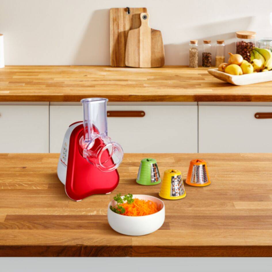 Rapide, simple et prêt à servir, réalisez en un tour de main vos salades de crudités. Grâce à ses 4 cônes de couleur différentes, préparez rapidement vos râpés ou tranchés de légumes, vos fromages grattés. Fresh express est très pratique : une large goulotte, un service direct, un nettoyage facile, et un format compact. Dégustez chaque jour de délicieuses salades.