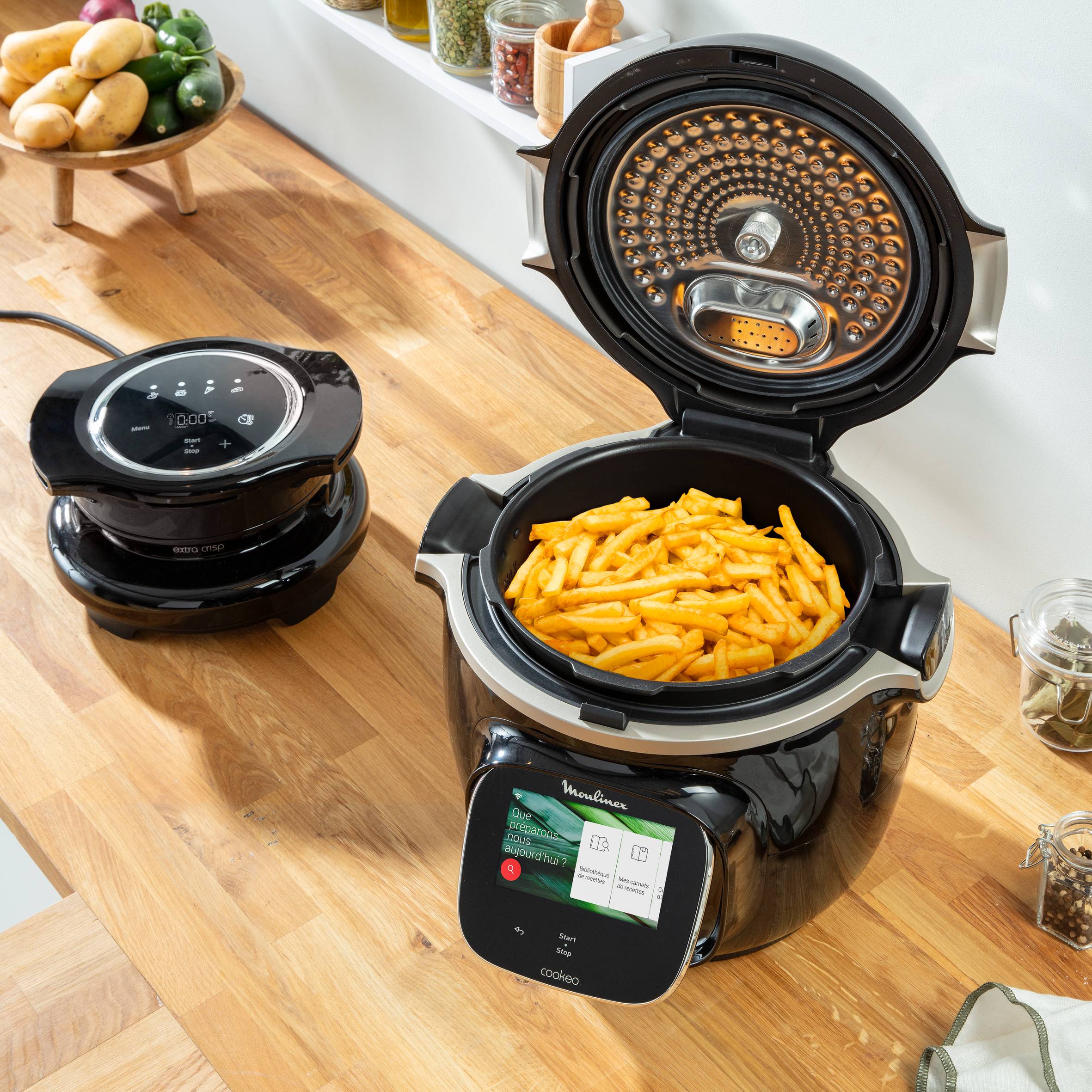Accessoire Extra Crisp pour transformer votre cookeo en air fryer* : faites rôtir vos poulets, griller vos gratins, frire vos frites à l’air et cuire vos gâteaux Il suffit de placer l’accessoire Extra Crisp sur votre Cookeo, puis de sélectionner l’un des 4 programmes automatiques Obtenez des résultats croustillants, sains et délicieux, avec peu ou pas d’huile Gagnez du temps en évitant le préchauffage : cet appareil est 30 % plus rapide qu’un four classique Utilisation sûre, aucun risque de brûler vos mains ni le plan de travail de la cuisine Compatible avec tous les Cookeo d'une capacité de 6 L, facile à nettoyer et à ranger