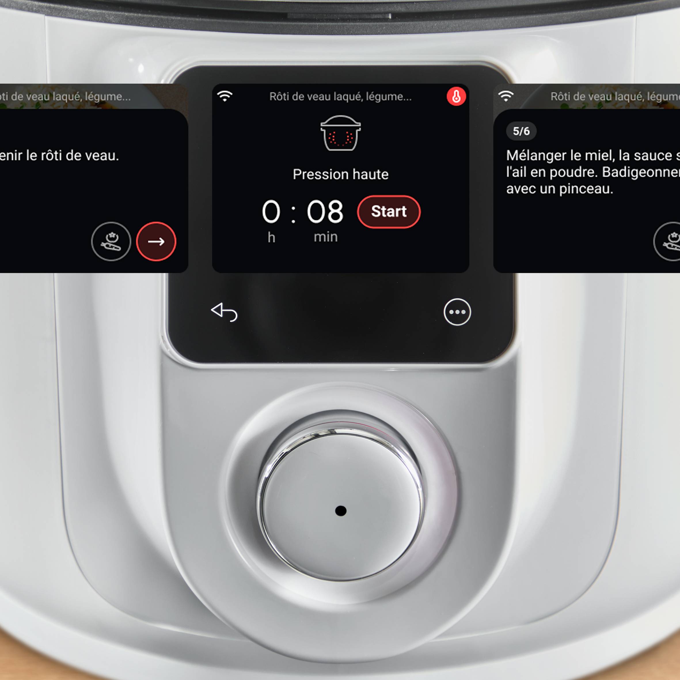 Accédez à un univers inédit de saveurs et de textures grâce à la combinaison unique de différents modes de cuisson, dont un mode air fryer puissant et la cuisson sous pression. 16 modes de cuisson dans un seul appareil, dont le mode air fryer, pour préparer tout ce dont vous rêvez : des plats mijotés, des gratins, des lasagnes, du pain ou encore des yaourts Instructions étape par étape sur l'écran, avec temps et température de cuisson préréglés pour une cuisine simplissime Le multicuiseur connecté le plus rapide de Moulinex, offrant des centaines de recettes en moins de 10 minutes et permettant de réaliser jusqu'à 80% d'économie d'énergie Une infinité de recettes adaptées à vos goûts, au temps et aux ingrédients que vous avez, à suivre pas à pas sur l'écran de votre Cookeo grâce à la connexion Wi-Fi et à l'application My Moulinex Une cuisine saine avec le mode de cuisson sous pression, qui préserve jusqu'à 80% de la vitamine C contenue dans vos ingrédients Préparez un repas complet grâce à la cuisson sur 2 étages (dans la cuve et sur le plateau), pour des résultats tendres et croustillants à la fois