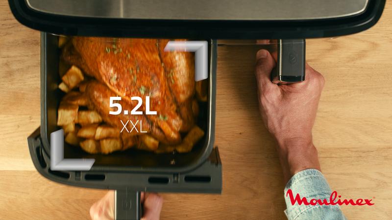 Un air fryer dual pour cuire 2 plats de 2 manières différentes en même temps, pour un repas complet préparé dans un seul et même appareil La synchronisation permet de finir les cuissons en même temps Capacité généreuse avec un tiroir de 5L pour les pièces volumineuses comme un rôti, et un tiroir de 3L pour les portions individuelles ou les accompagnements 6 programmes intuitifs pour rôtir, cuire, griller, déshydrater, réchauffer une multitude de plats sans surveillance Consomme jusqu'à 70 % d'énergie en moins et cuit jusqu'à 40 % plus rapidement* Technologie de cuisson à air chaud Extra-Crisp de Moulinex pour des résultats dorés et croustillants avec 99 % de matière grasse ajoutée en moins* Application gratuite avec des services exclusifs et une grande variété de recettes quotidiennes prêtes en moins de 15 minutes Tiroirs et grille compatibles lave-vaisselle pour un nettoyage sans effort Garantie réparabilité 15 ans pour contribuer à la protection de l'environnement et à la réduction des déchets