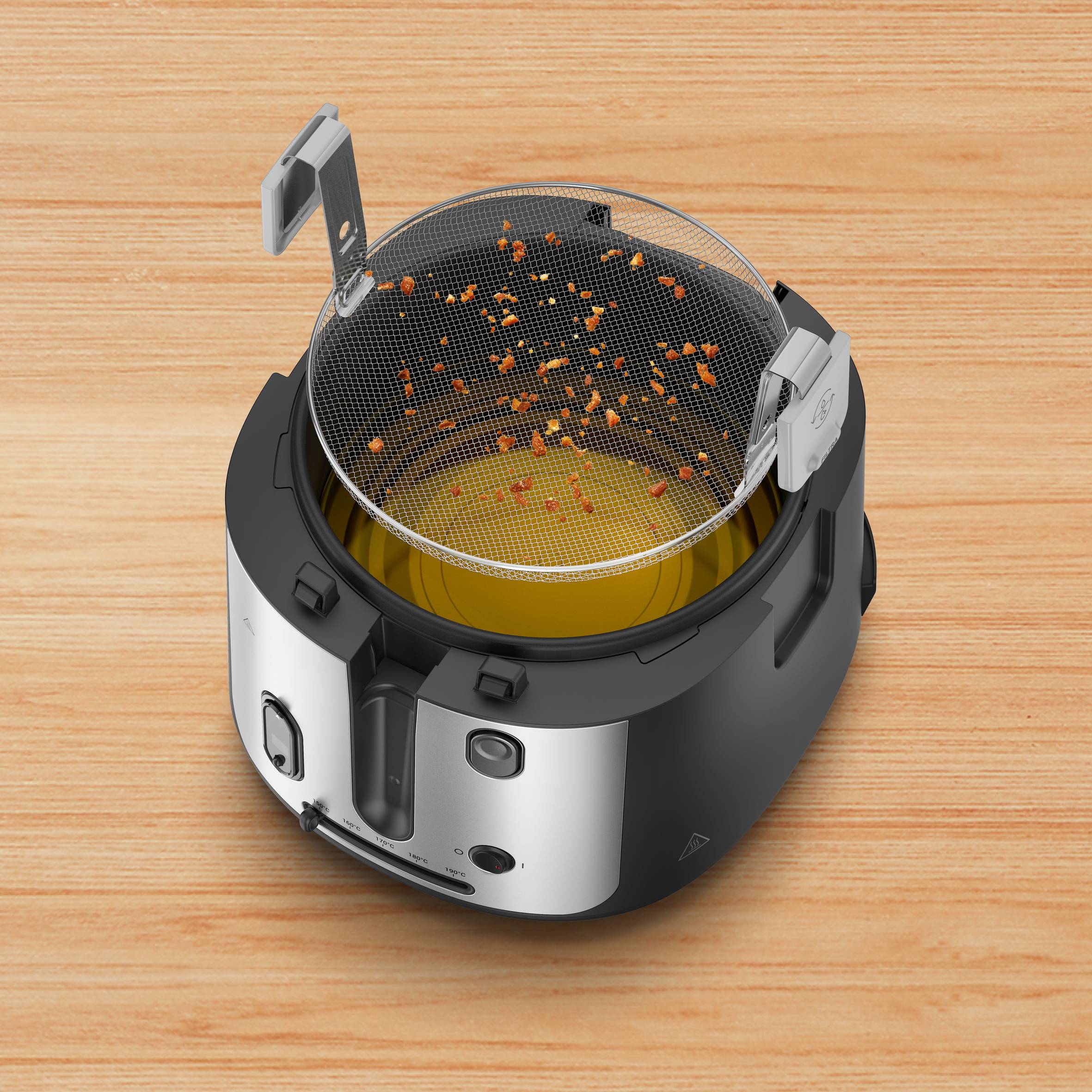 Friteuse dotée de la technologie de couvercle Grandview pour une visibilité parfaite et des résultats impeccables d'un seul coup d'œil Filtre pour une huile plus propre, qui dure plus longtemps et des aliments plus savoureux Design moderne et élégant avec un revêtement en métal pour apporter une touche de raffinement à toutes les cuisines Grande capacité de 1,2 kg idéale pour toute la famille (jusqu'à 4 personnes) - Friteuse compacte et poignée pliable pour un rangement facile dans toutes les cuisines