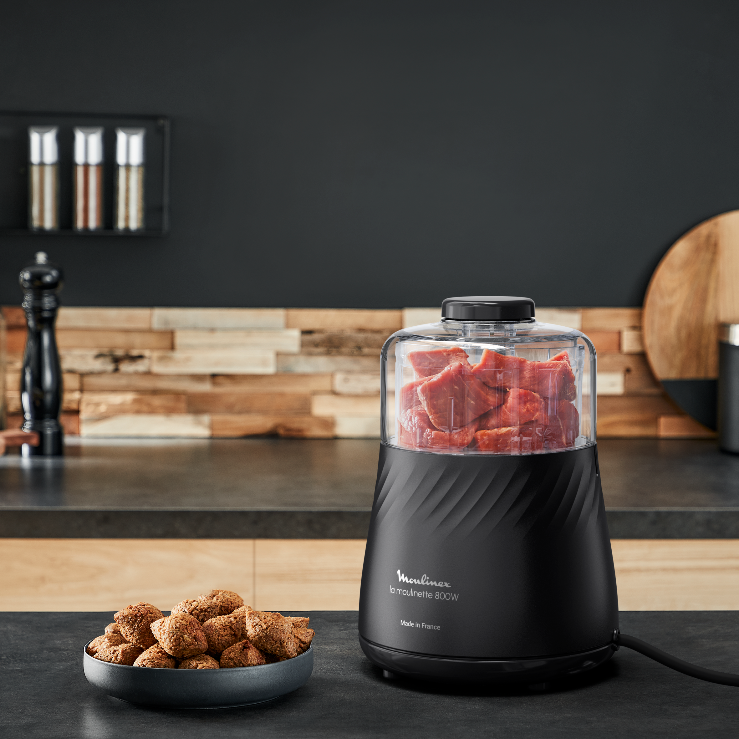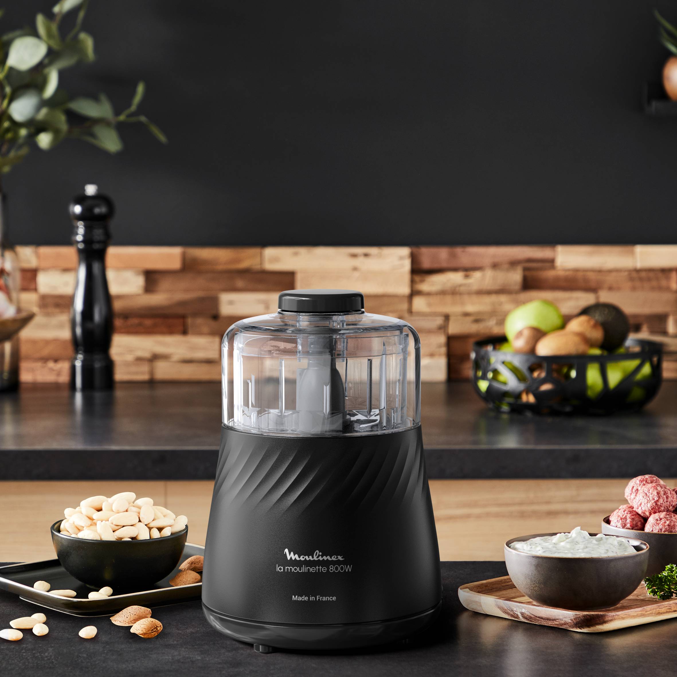 Votre kit La Moulinette Eco Respect, Hachoir, Eco conçue en France, Fonsction 4 en 1, Capacité 500 ml, Noire