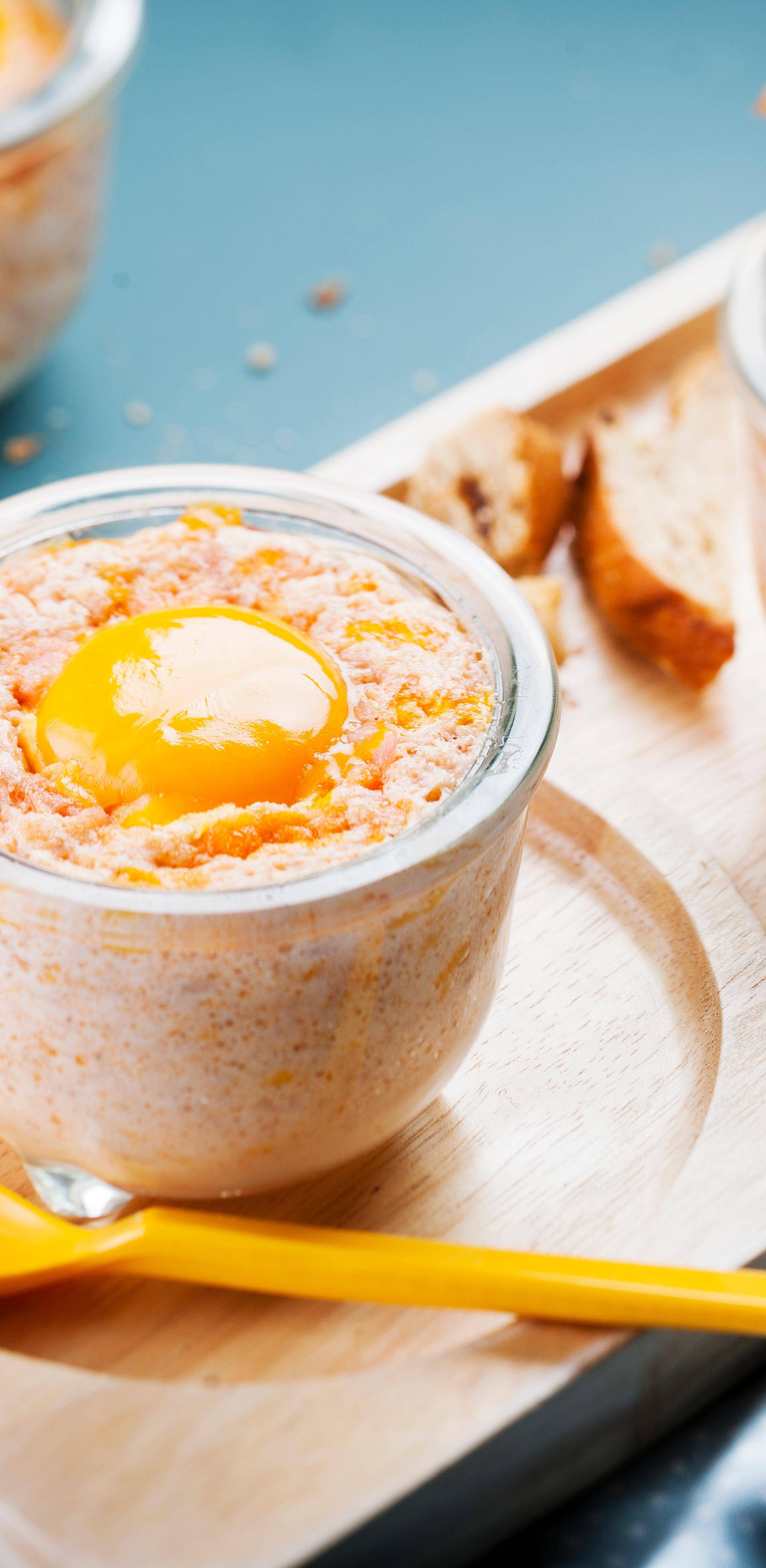 Sortir les verrines et ajouter un jaune d’œuf dans chacune. Les remettre dans la cuve sans leur couvercle.