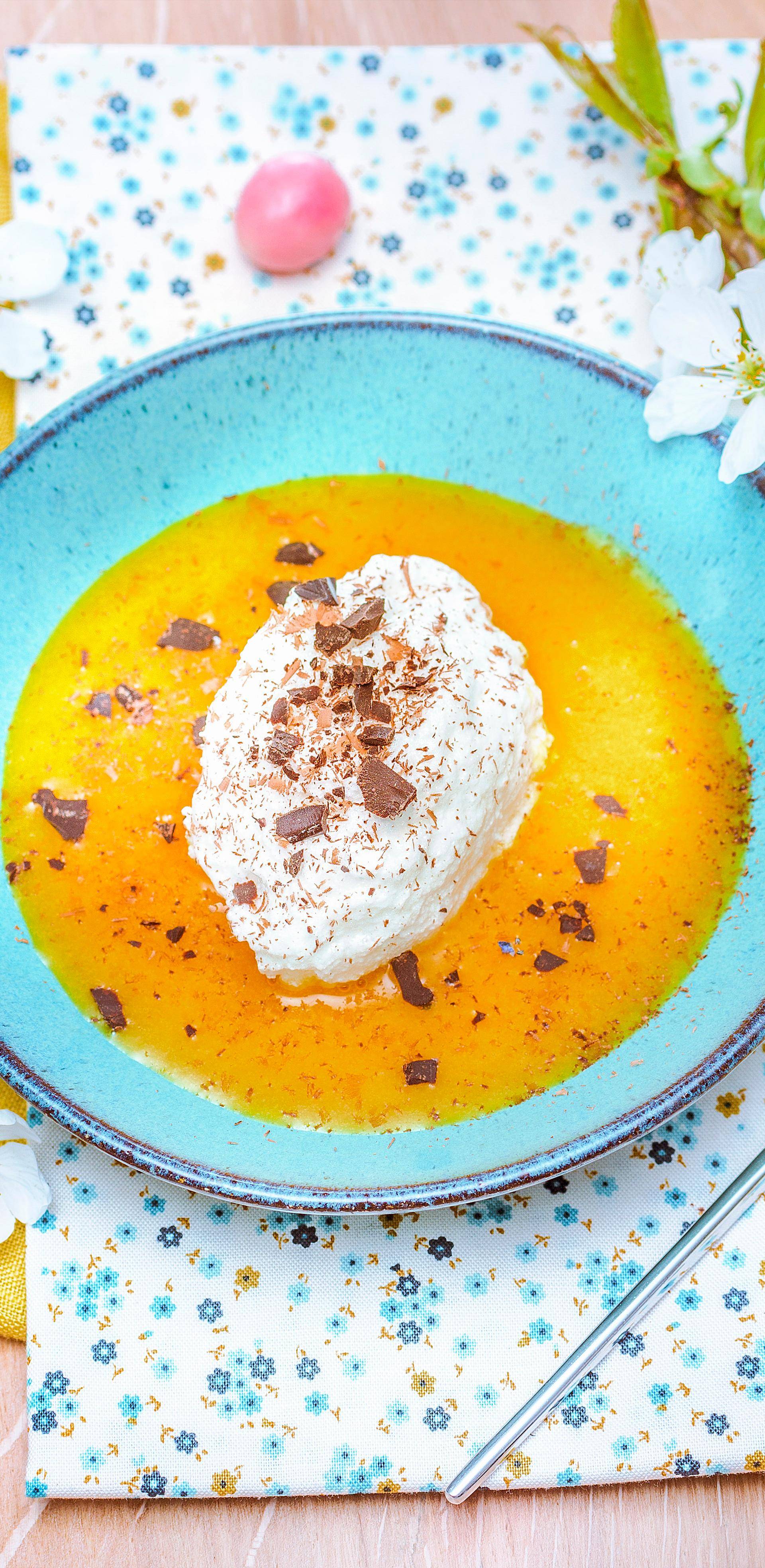 Répartissez le coulis de mangue dans les ramequins. A l'aide d'une cuillère à soupe, déposez délicatement les œufs à la neige sur le coulis et saupoudrez de chocolat râpé.