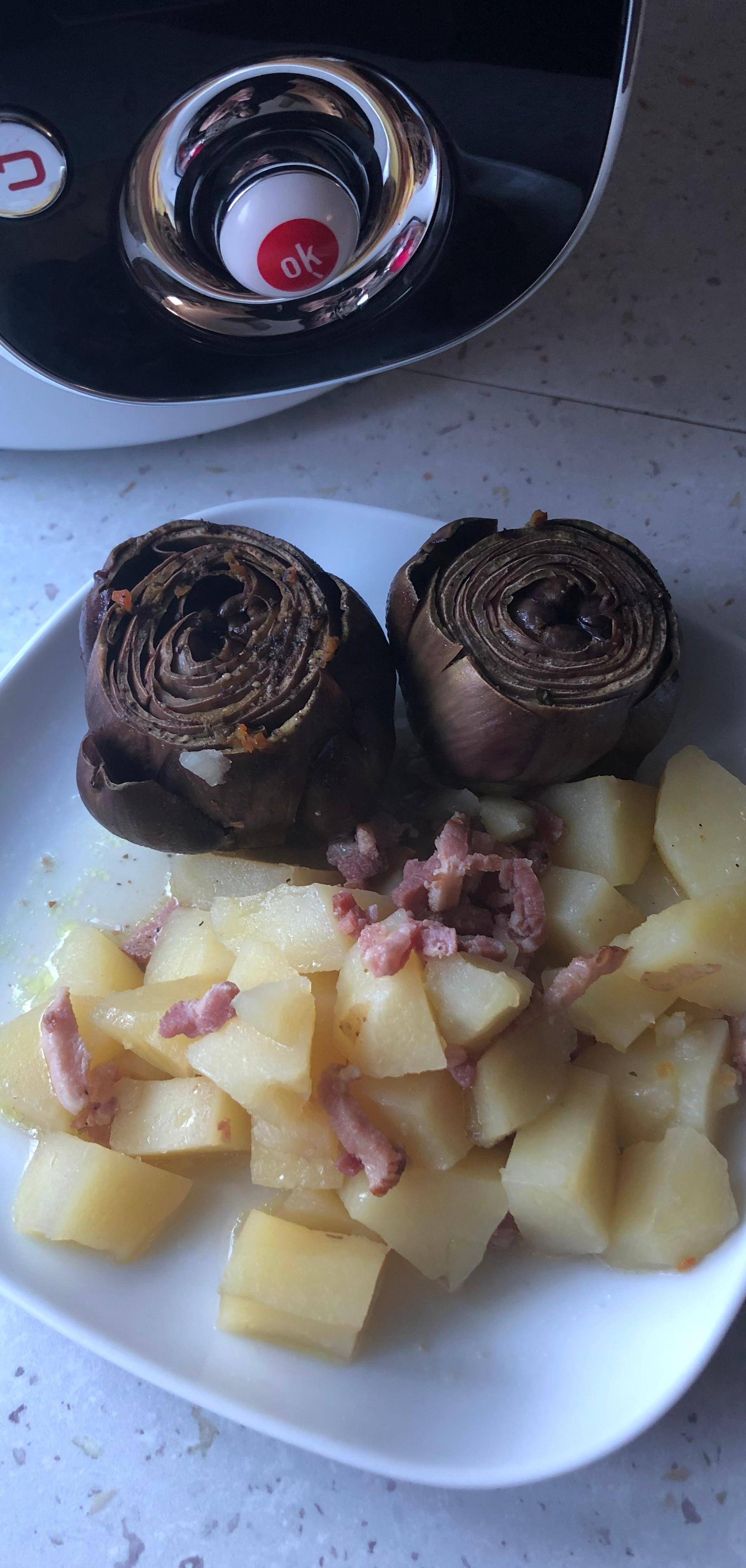 Poser les artichauts sur les pomme de terre Émietter le cube de volaille Mettre une noisette de beurre sur chaque artichaut Poivrer puis verser 200 ml d’eau
