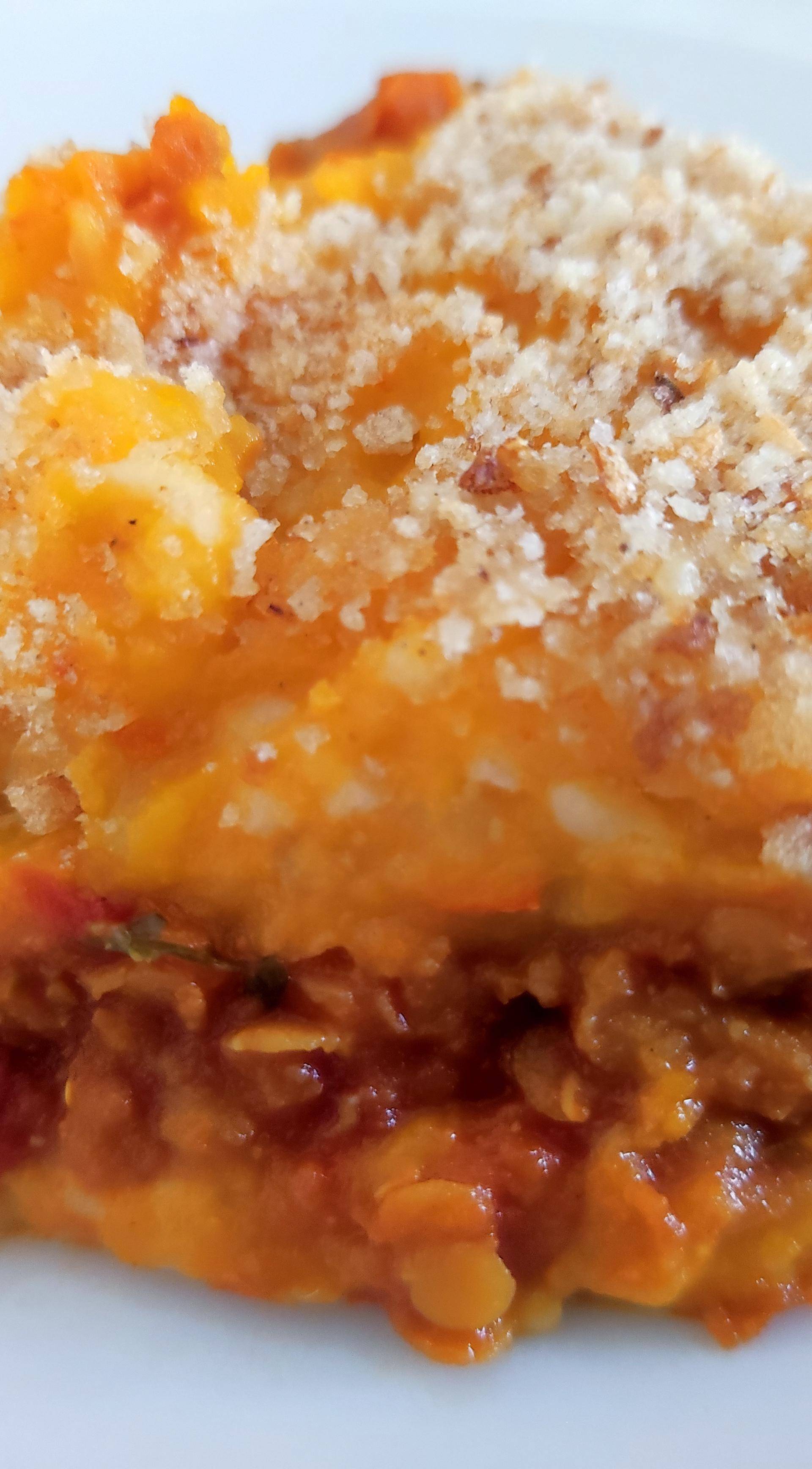 A la fin de la cuisson, mettre la moitié des lentilles dans un plat allant au four, puis la moitié de la purée et recommancer pour utiliser le restant des ingrédients. Déposer sur le dessus la chapelure et quelques noisettes de beurre. Préchauffer le four à 180°et enfourner pour 20mn.