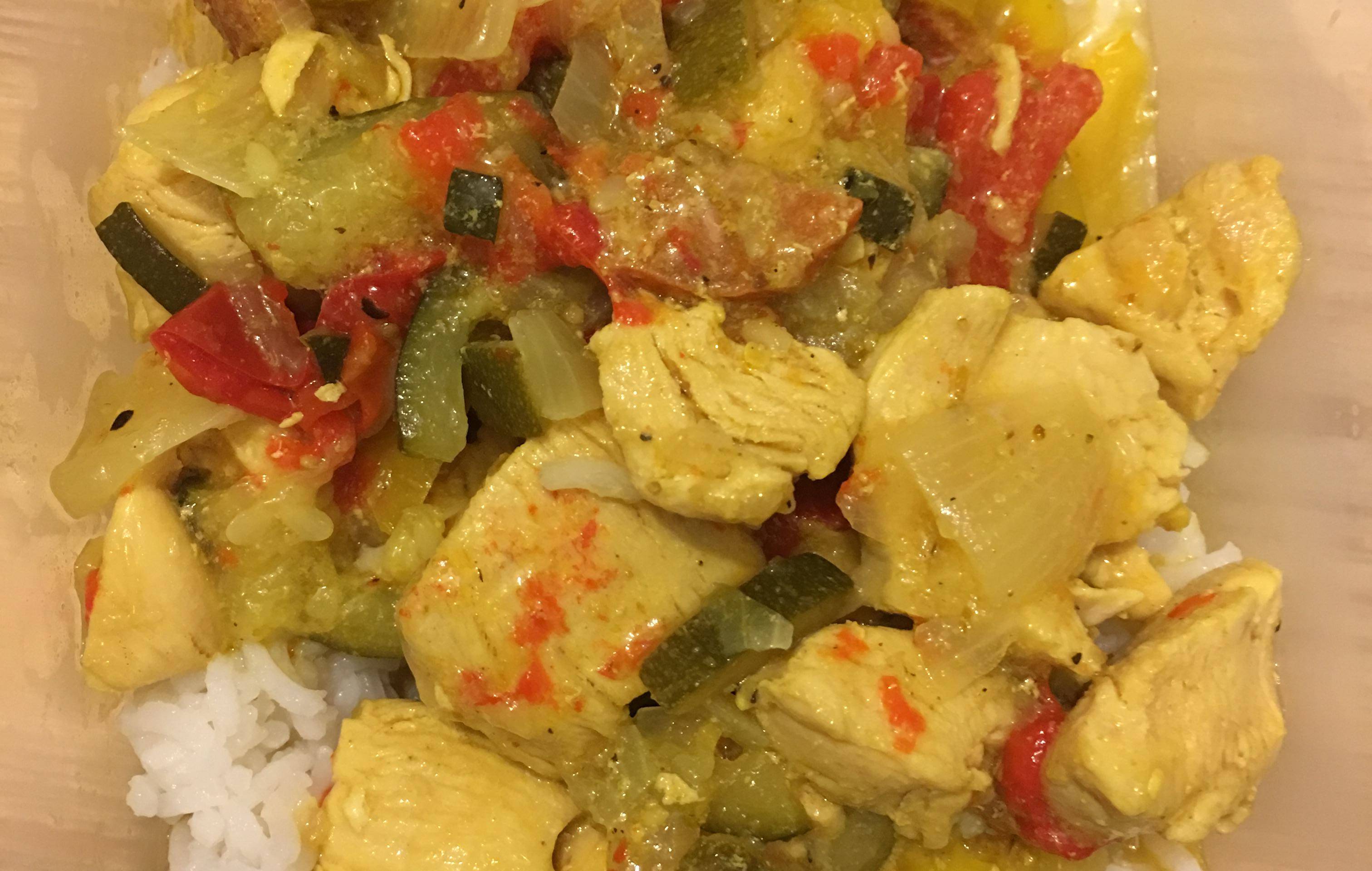 Faites revenir les oignons 2 minute en mode dorer puis ajouter les poivrons, les carottes et les blancs de poulet pour encore 3 minutes.