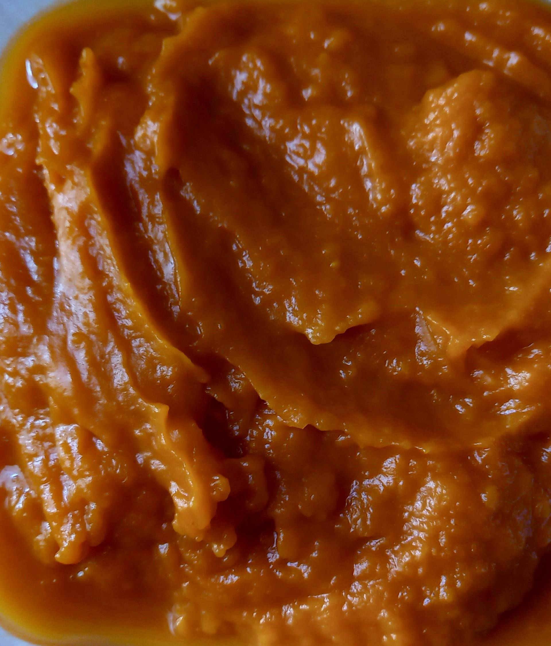 En mode Dorage, faire revenir l'oignon avec l'huile d'olive. Ajouter la gousse d'ail écrasée. Bien remuer. Ajouter les carottes et le potimarron, remuer encore. Émietter le cube de bouillon dans la cuve, ajouter l'eau et le concentré de tomates. Remuer.