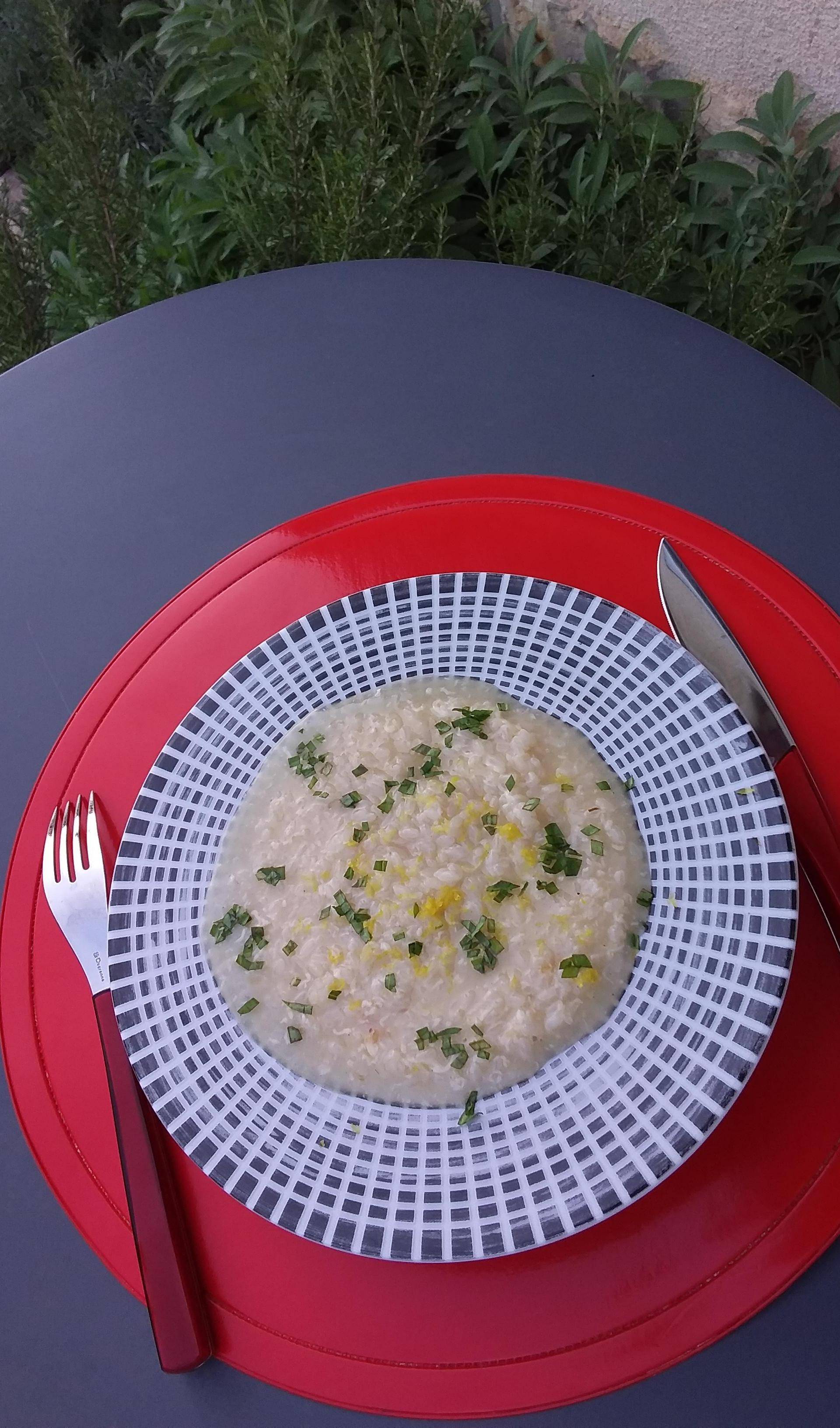 Ajoutez le parmesan en tournant pour que votre riz soit bien onctueux Servez dans l’assiette, ajoutez un peu de zeste de citron et les feuilles de basilic et servez chaud