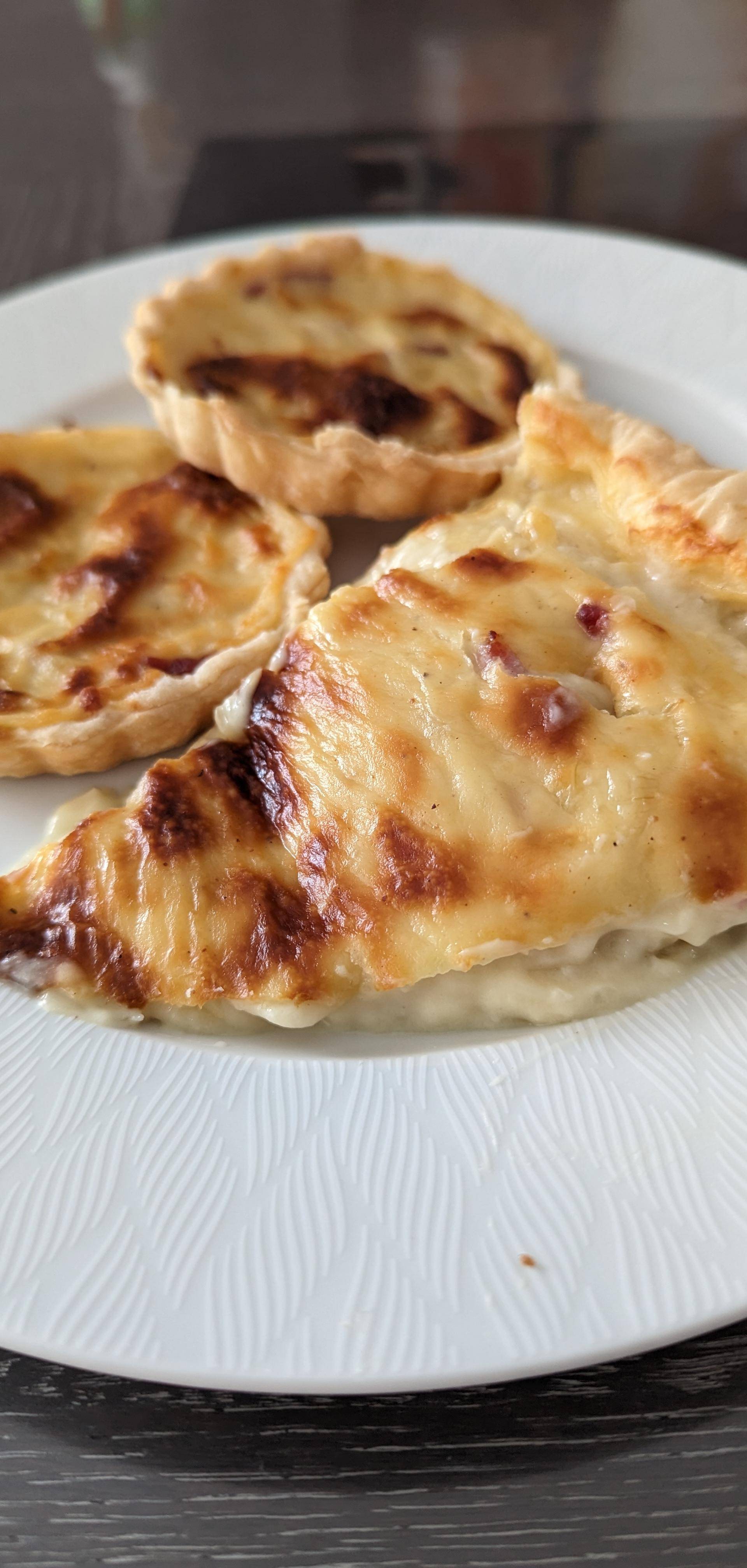 Foncer un moule à tarte et/ou à tartelettes avec la pâte brisée et remplir avec l'appareil à oignons.