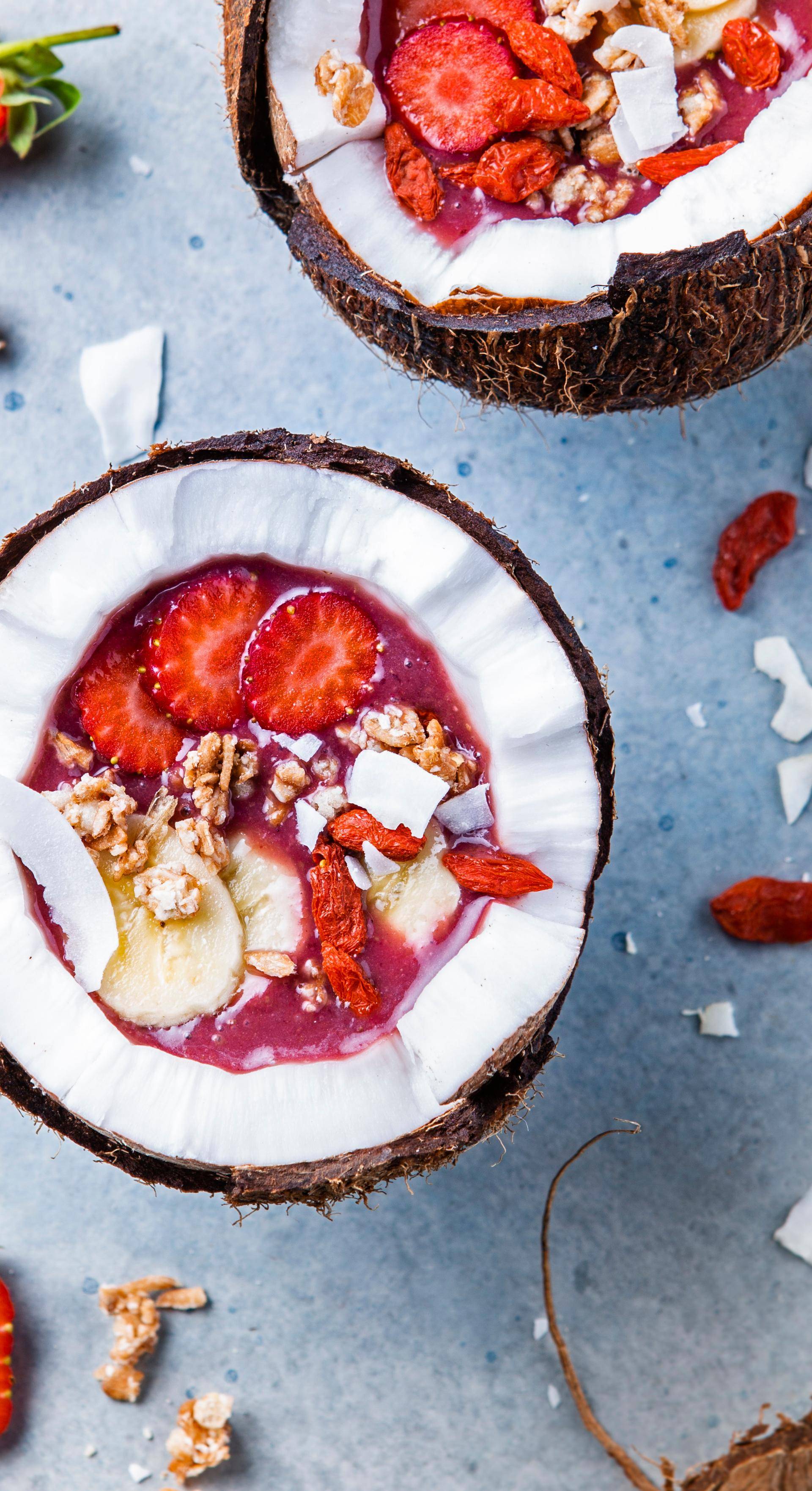 Coupez les 4 fraises en morceaux. Cassez les noix de coco en deux. Dans chaque moitié de noix de coco (ou dans des bols), versez le smoothie puis décorez avec un peu de granola, des rondelles de banane, des fraises, des baies de goji et quelques copeaux de noix de coco.