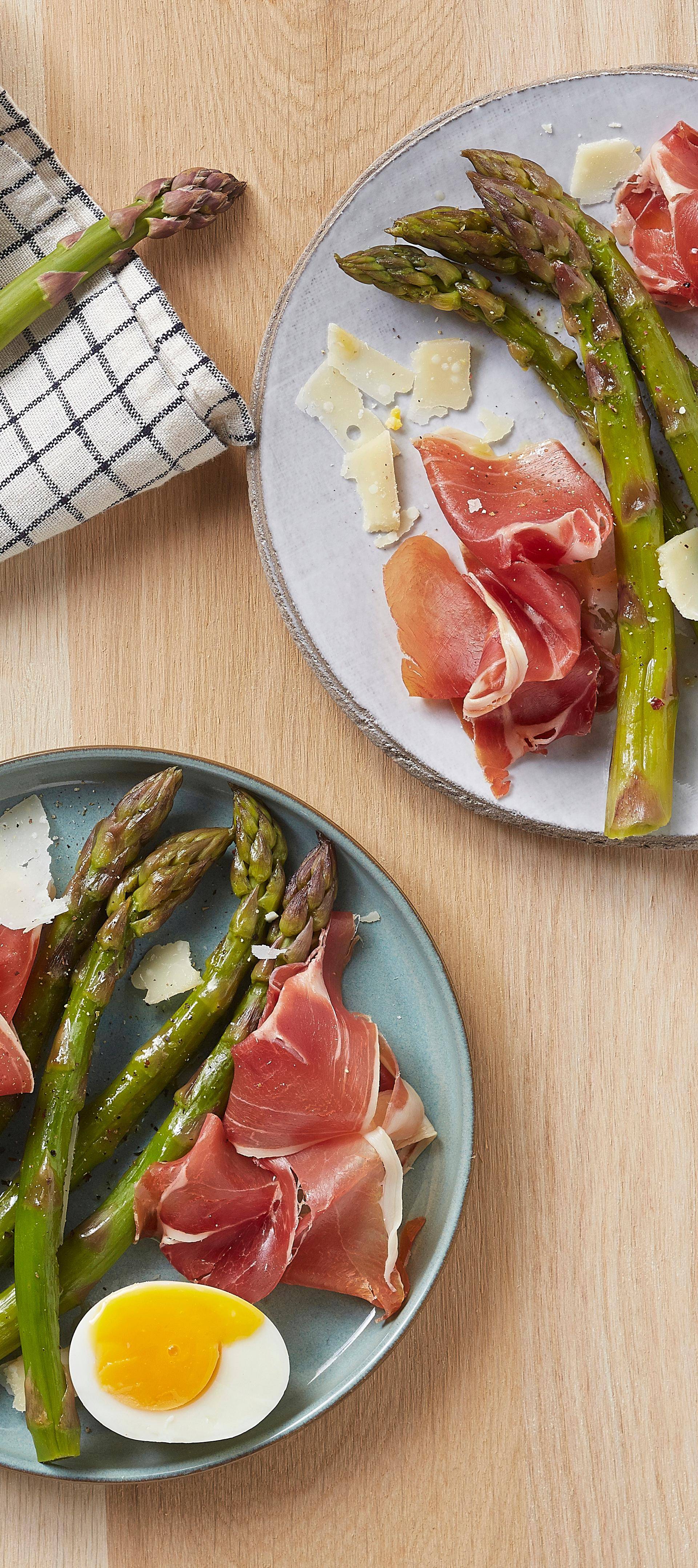 Au moment de servir, disposer les asperges dans quatre assiettes, ainsi qu’une tranche de jambon par assiette. Poser par-dessus 1 œuf écalé et fendu en deux. Parsemer de copeaux de parmesan et poivrer.