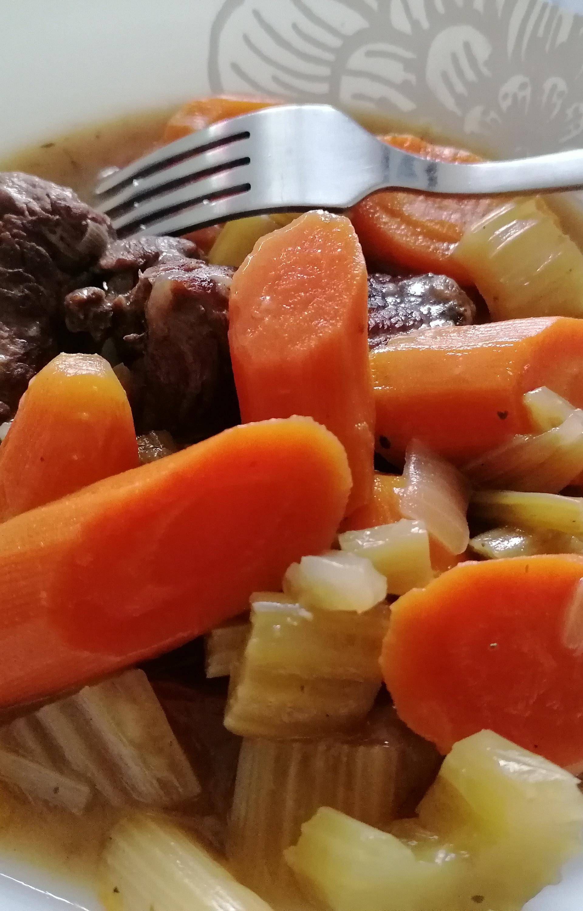 Retirer la viande et faire suer l'oignon émincé. Puis ajouter les légumes et. mélanger. Ré-incorporer la viande, saupoudrer de farine, bien remuer pour tout imprégner. Déglacer enfin avec le vin rouge.
