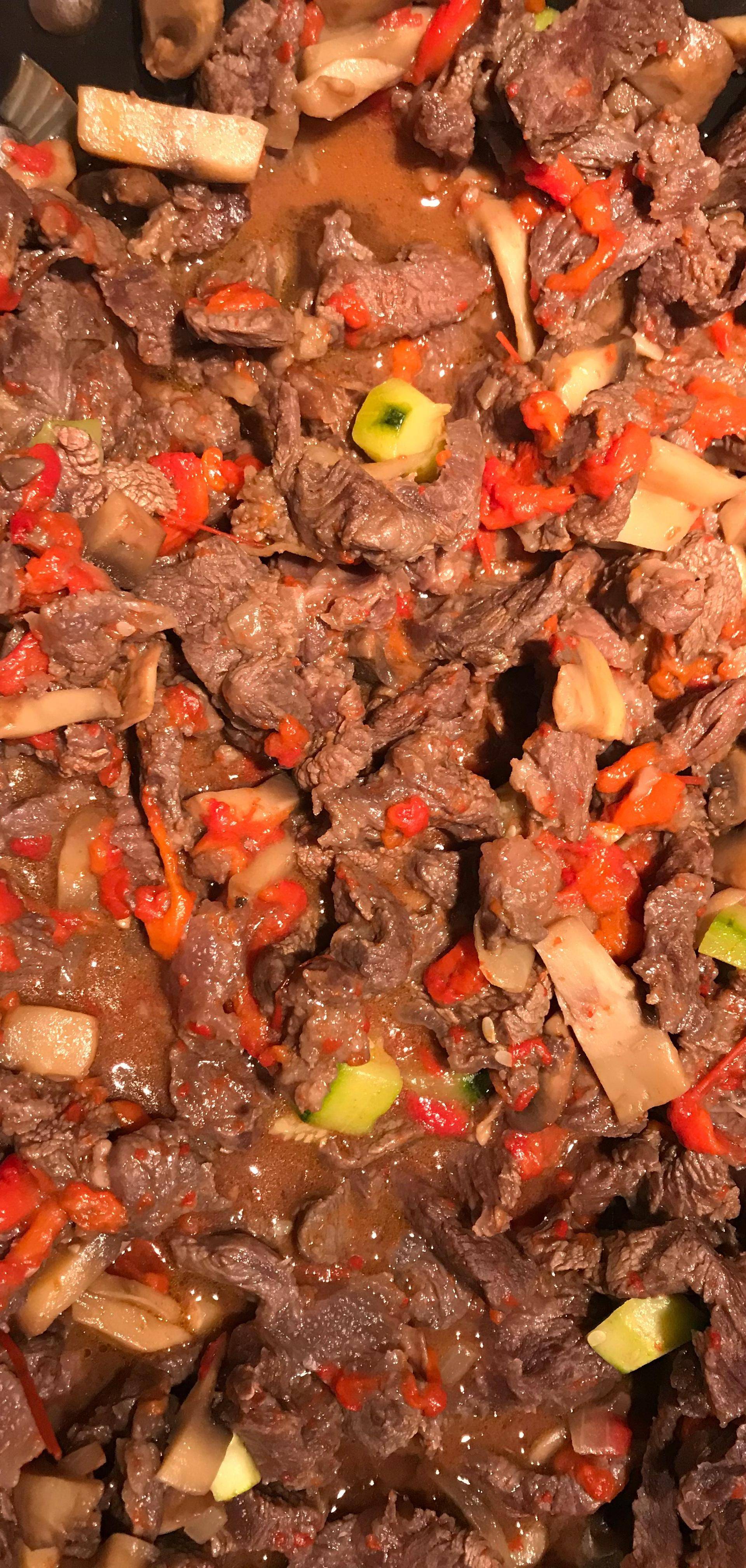 Faire revenir l’oignon environ 2 minutes en mode dorer, puis ajouter les champignons et les poivrons et laisser les revenir 5 minutes. Enfin ajouter la viande