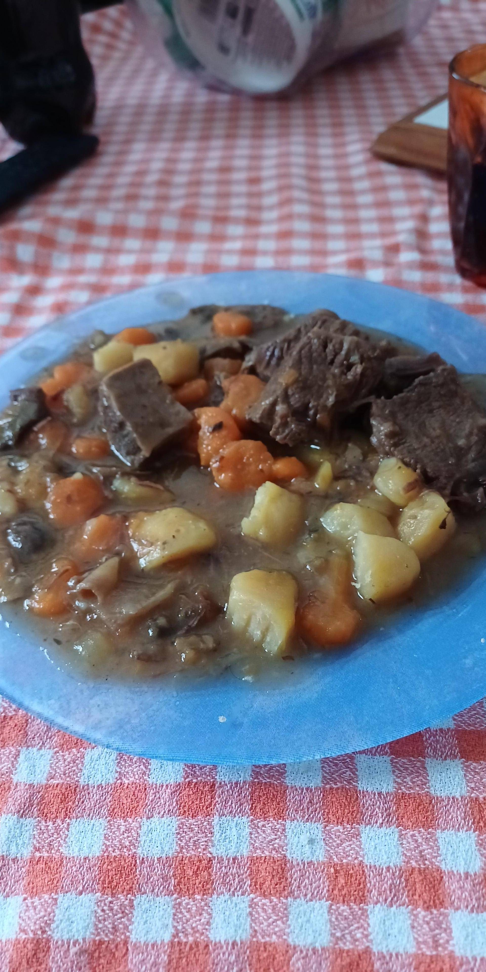 Mettre les champignons, lardons , pomme de terre et carottes, rajouter 300ml avec le bouillon d eau , salé et poivre