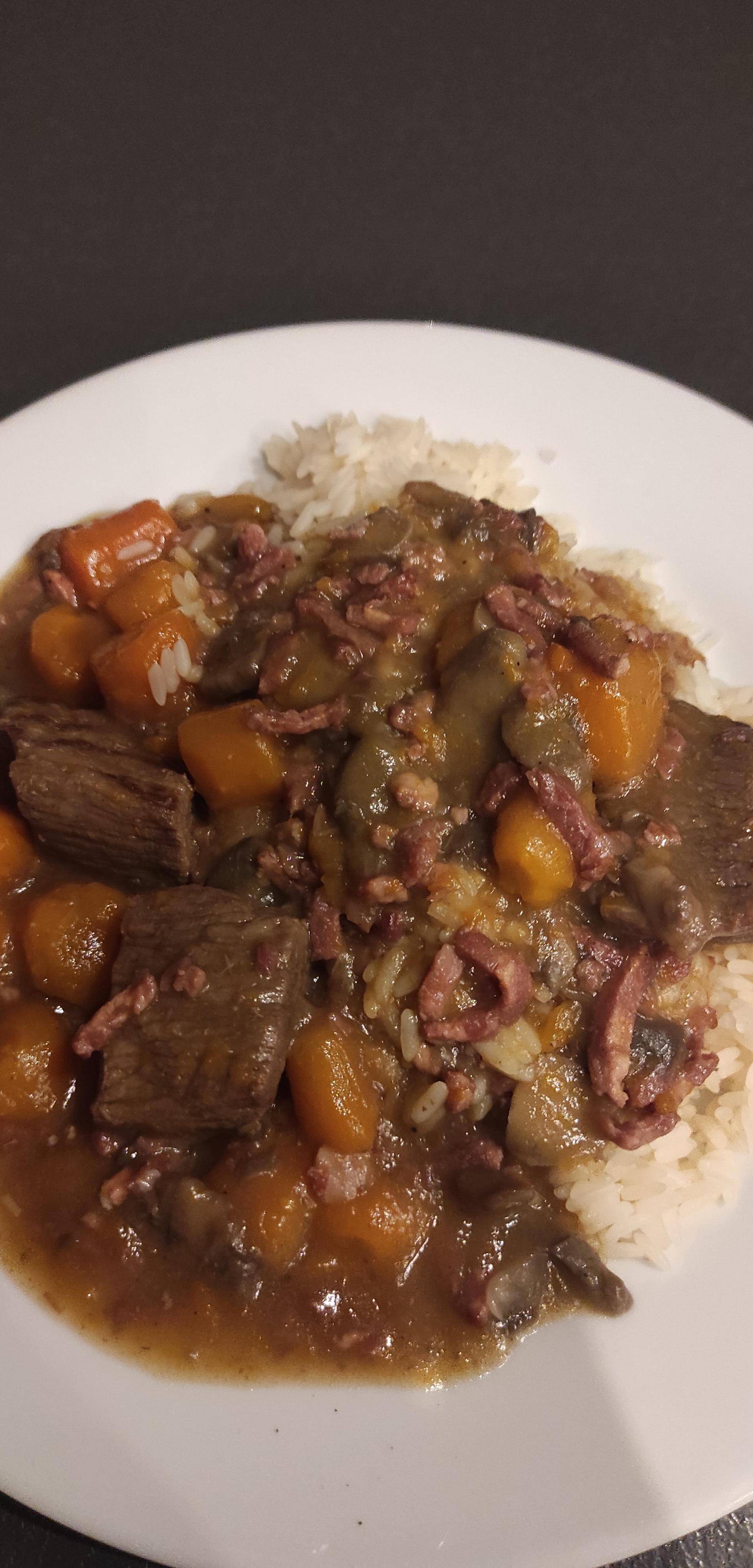 Mettre le bœuf coupé en morceaux, les lardons et l'échalote coupé en mode dorer