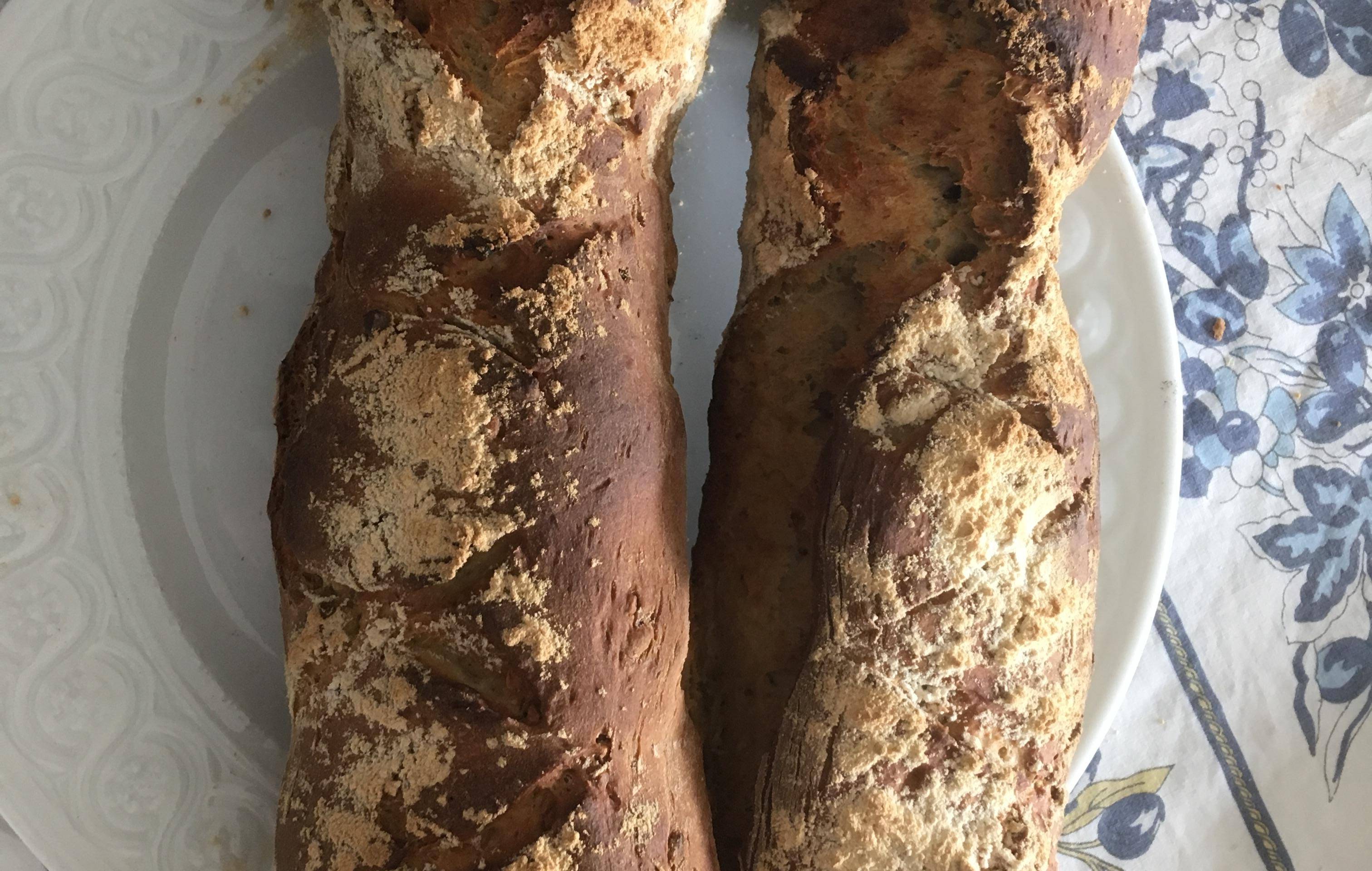Préchauffer le four à 250 degrés sur chaleur tournante en déposant un plat à tarte rempli d’eau sur la partie basse du four. Saupoudrer de farine et enfourner les deux baguettes. Créer une belle vapeur d’eau dans le four en faisant déborder légèrement l’eau du plat à tarte à l’aide d’une cuillère en bois. Mettre le four en cuisson traditionnel et faire cuire 25min à 250 degrés.