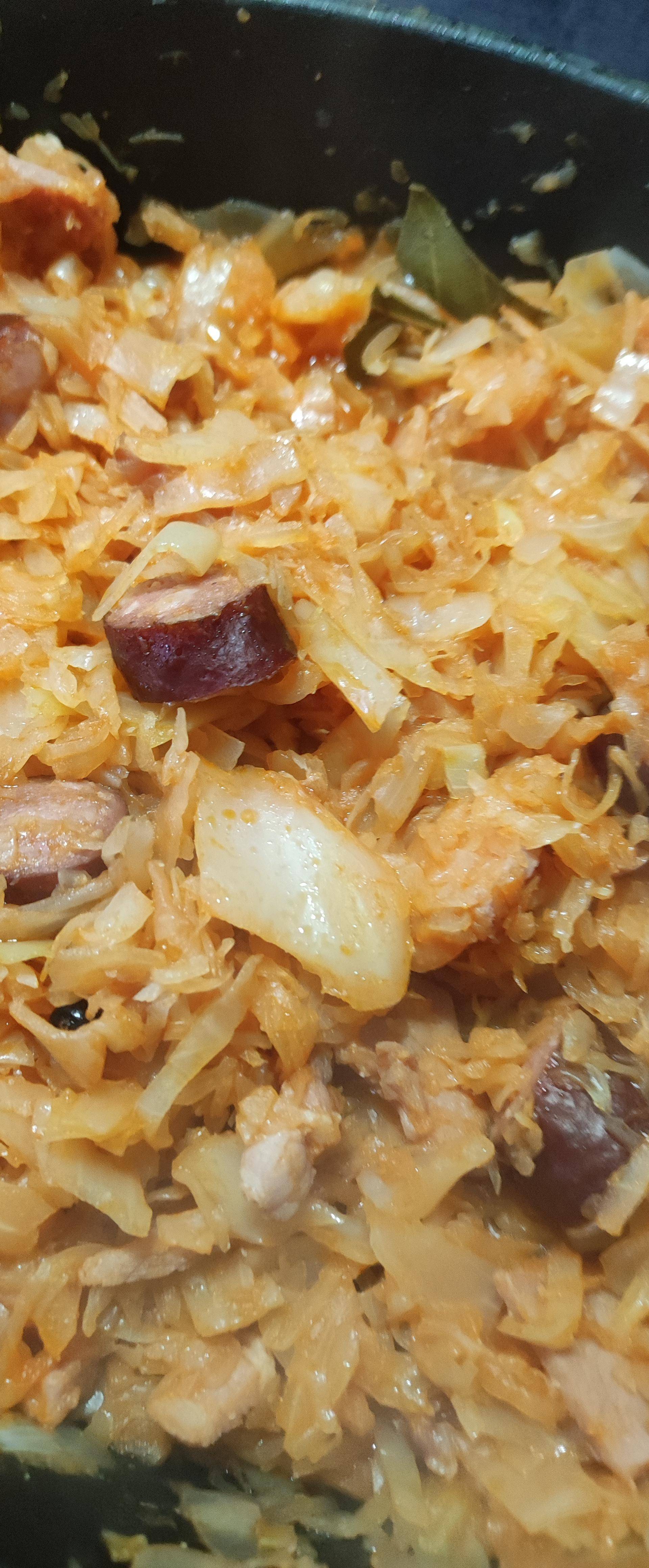 Une fois le chou cuit, vider la cuve de l'eau et y mettre les oignons, les lardons et les metka a revenir quelques minutes