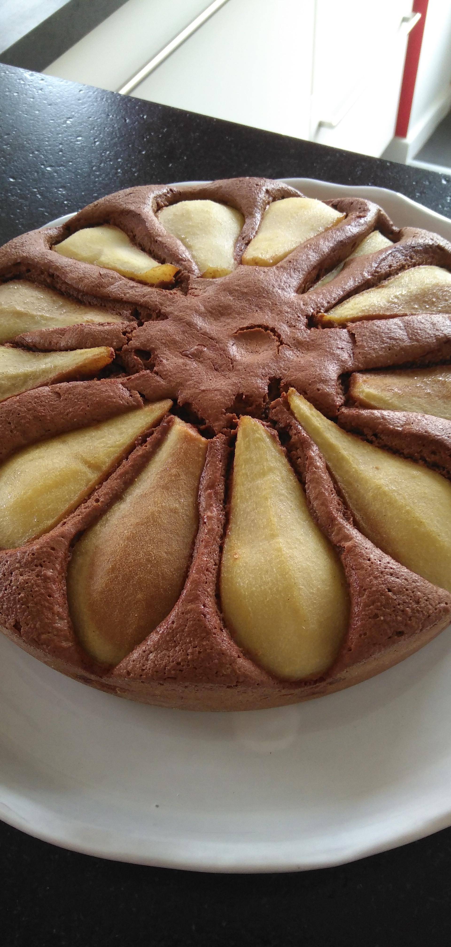 Versez la pâte dans un moule beurré et fariné. Taillez les poires en quatre, ôtez le coeur et placez les poires sur la pâte. Cuire 45min à 180. Attendre 10min avant de démouler. A déguster avec une crème anglaise