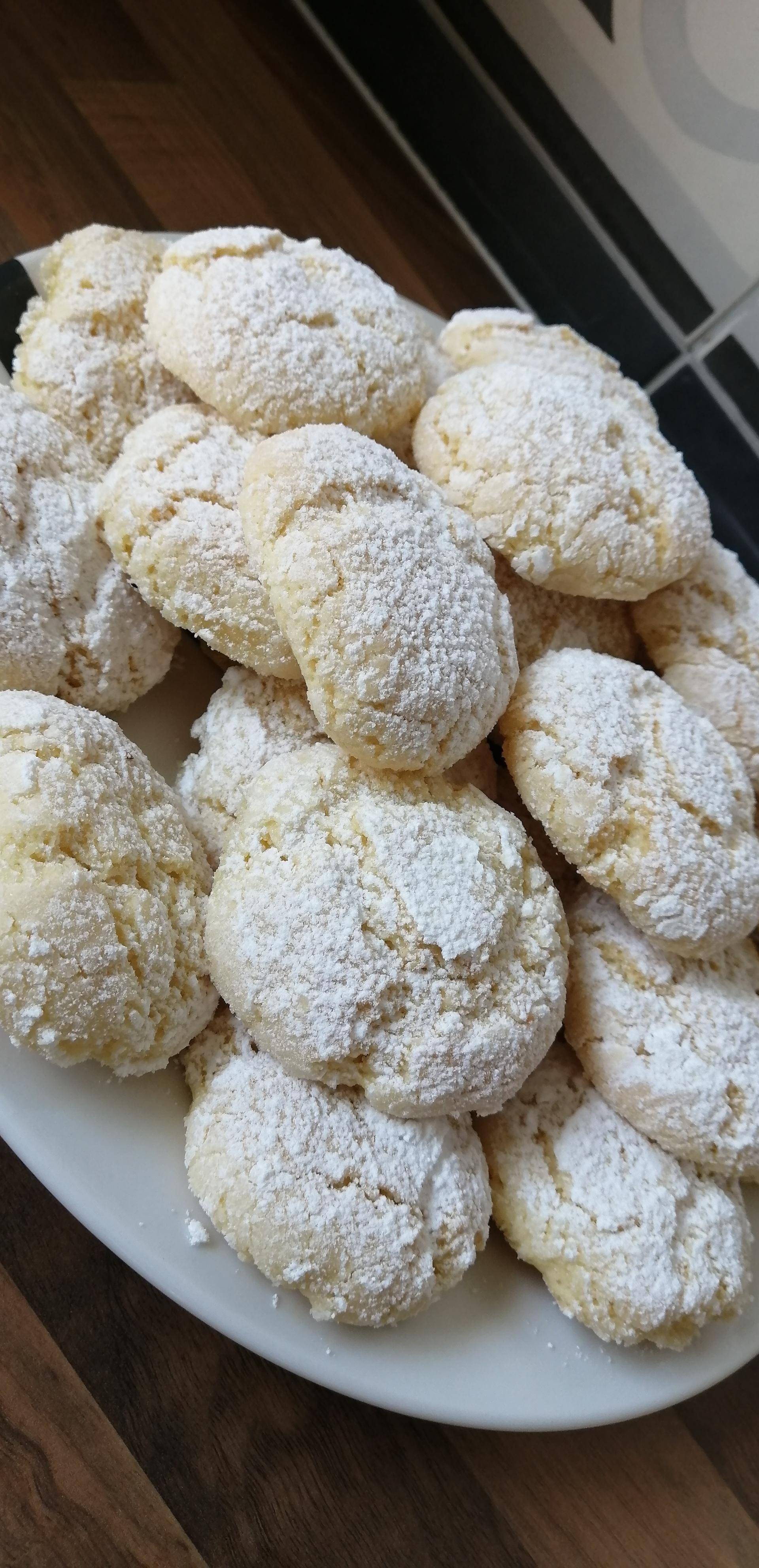 Faire des petits tas de pâte sur la plaque à pâtisserie recouvert de papier sulfurisé Saupoudré de sucre glace Cuire 10min à 180° À la sortie du four laisser refroidir avant de déguster Bon appétit !