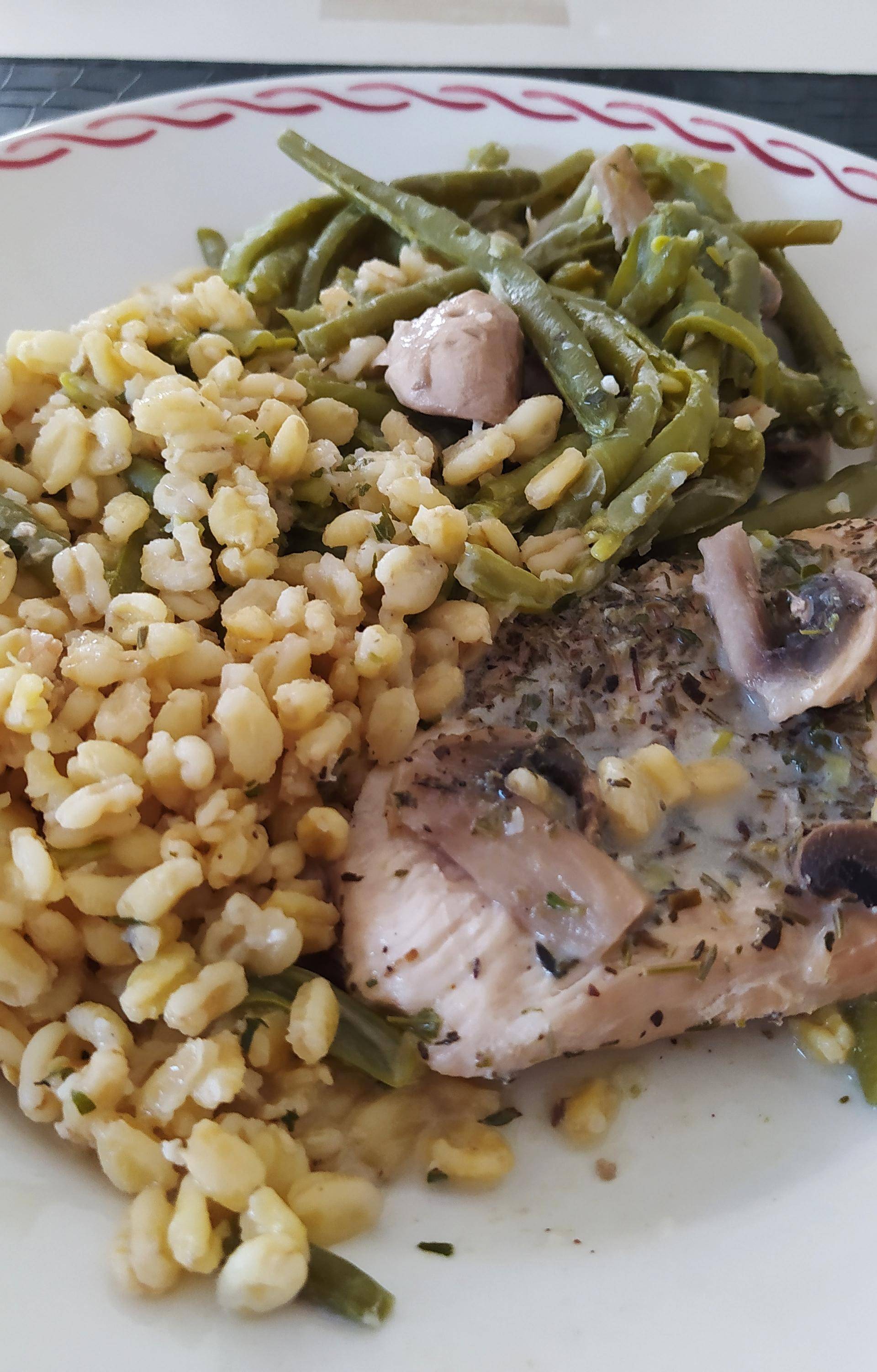 Rajouter herbes de provinces sur la dinde. Sel poivre sur le blé, haricots et dinde. Mélanger seulement le blé. Ail persil sur les haricots verts ainsi que crème fraîche. Mélanger.