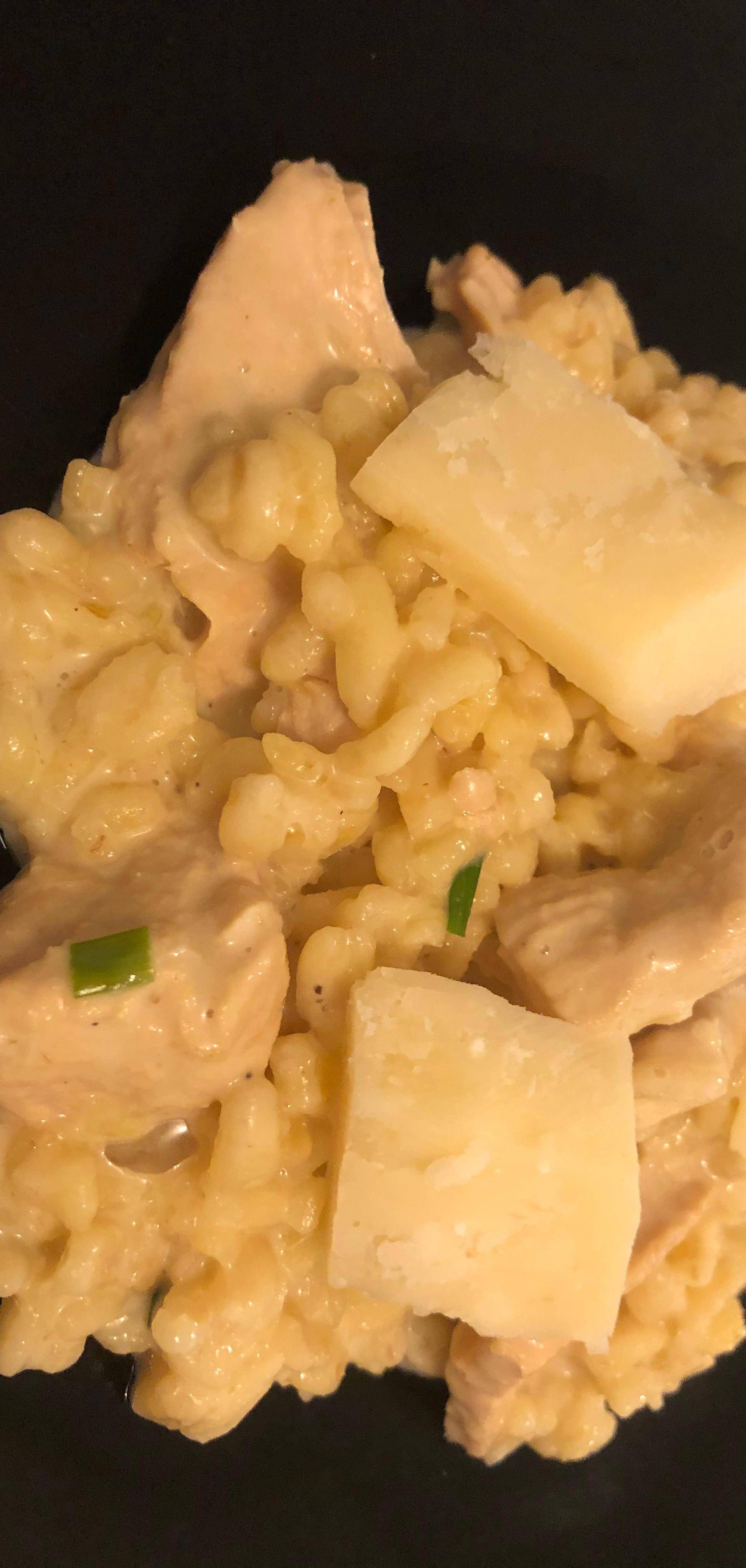 Ajouter la crème et la ciboulette mélanger. Puis saler et poivrons. Dans l’assiste parsemer au dessus des copeaux de parmesan.