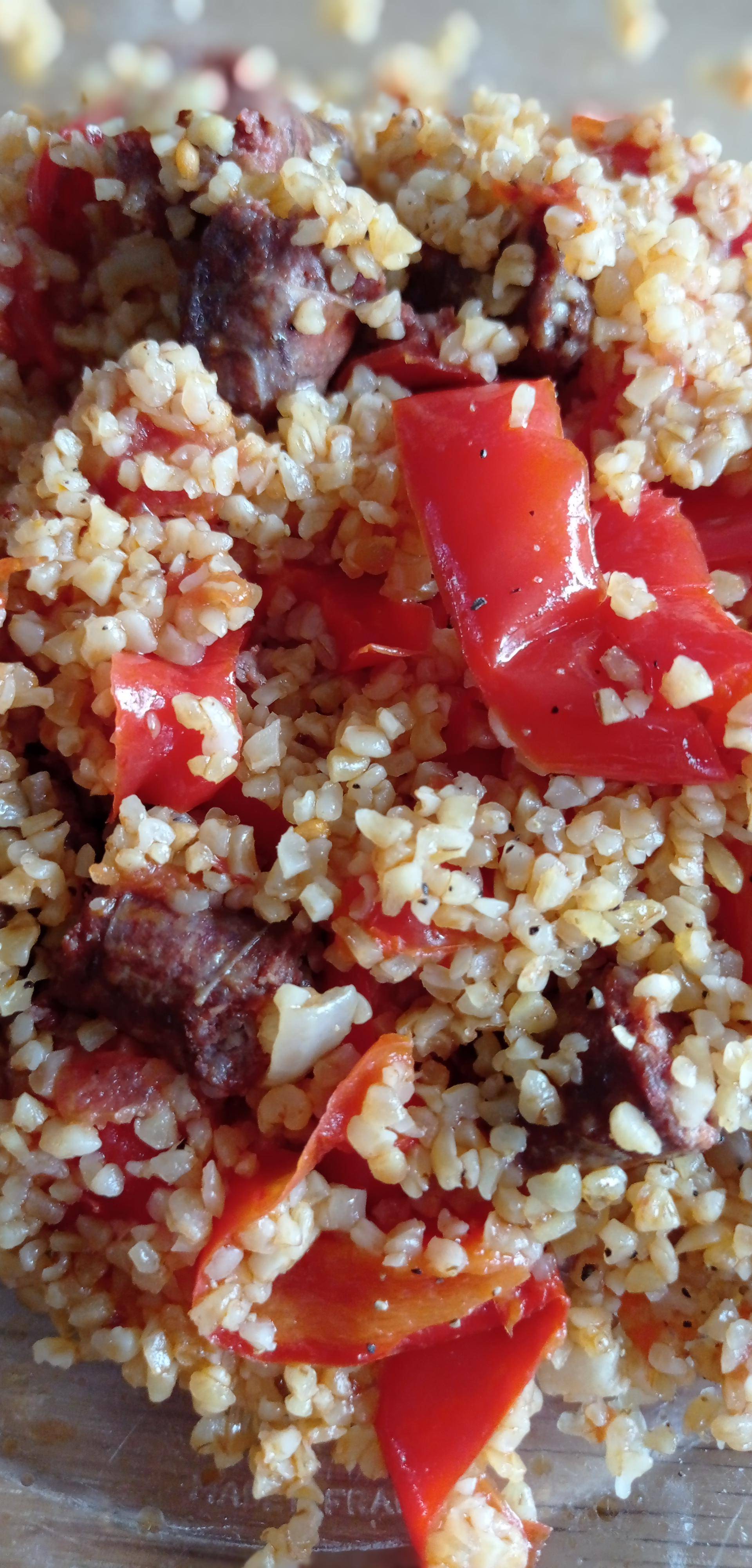 Émincez les oignons, coupez en lamelles les poivrons, les tomates en petits dés, les merguez en petits morceaux