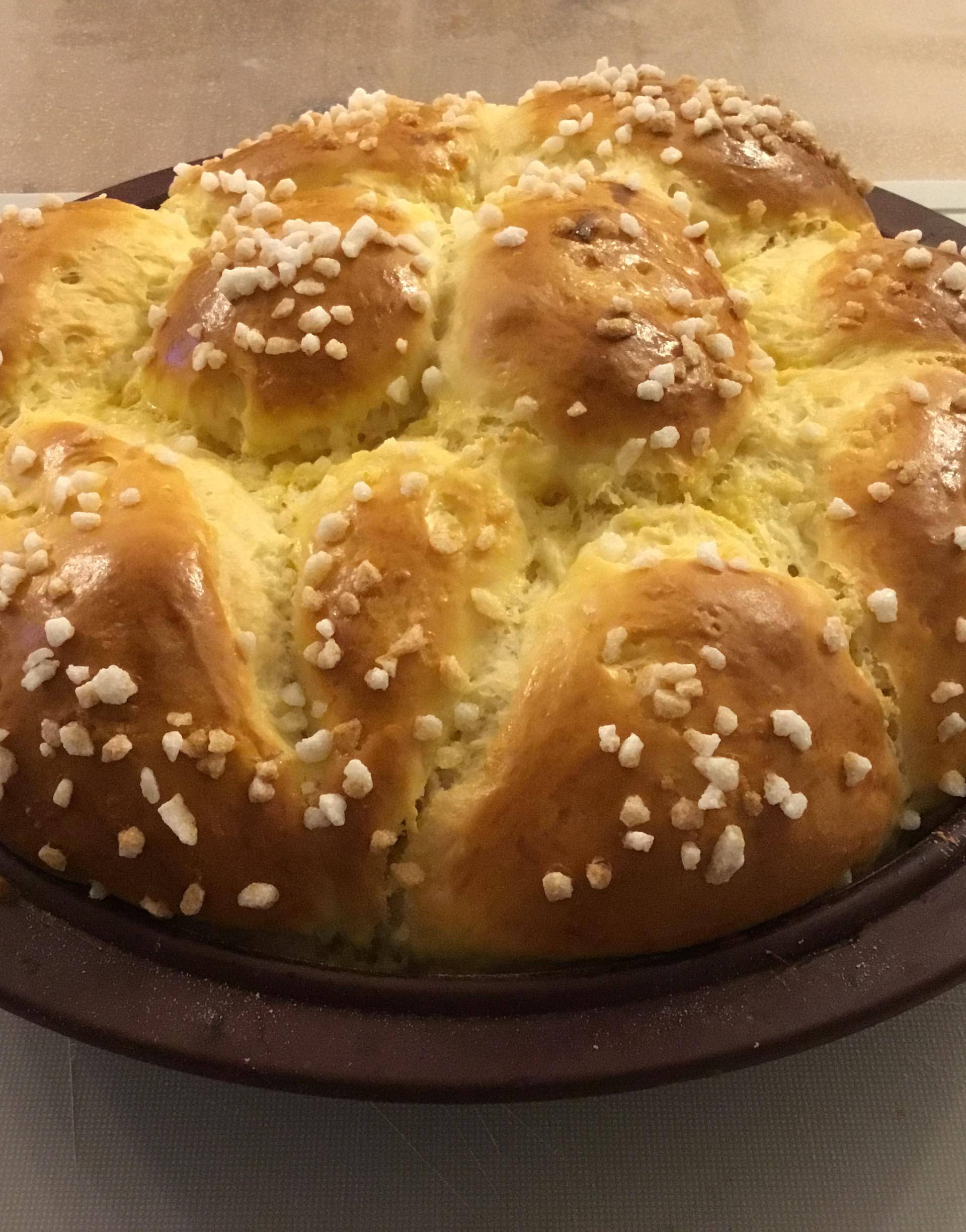 À la fin de cette seconde pousse re badigeonner à l’oeuf ( s’il en reste) et saupoudrer de perles de sucre ( facultatif) puis enfourner : chaleur tournante, 155°, pendant 25minutes en mettant un bol d’eau dans le bas du four - si vous avez un four combiné vapeur il faut mettre 155°- 25mn - vapeur niveau2