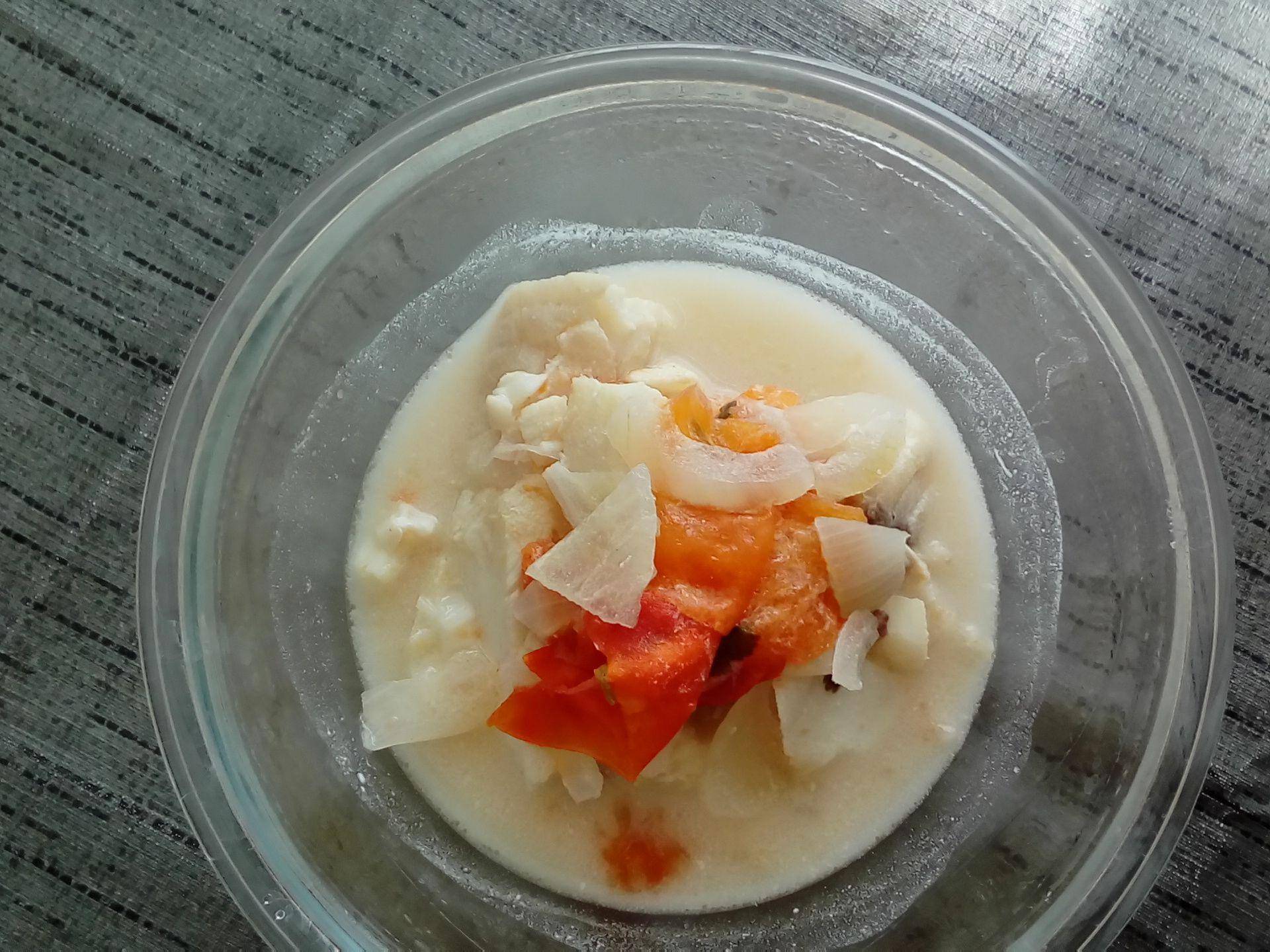 Mettre tous les ingrédients, sans le poisson et mélanger. Puis mettre le poisson