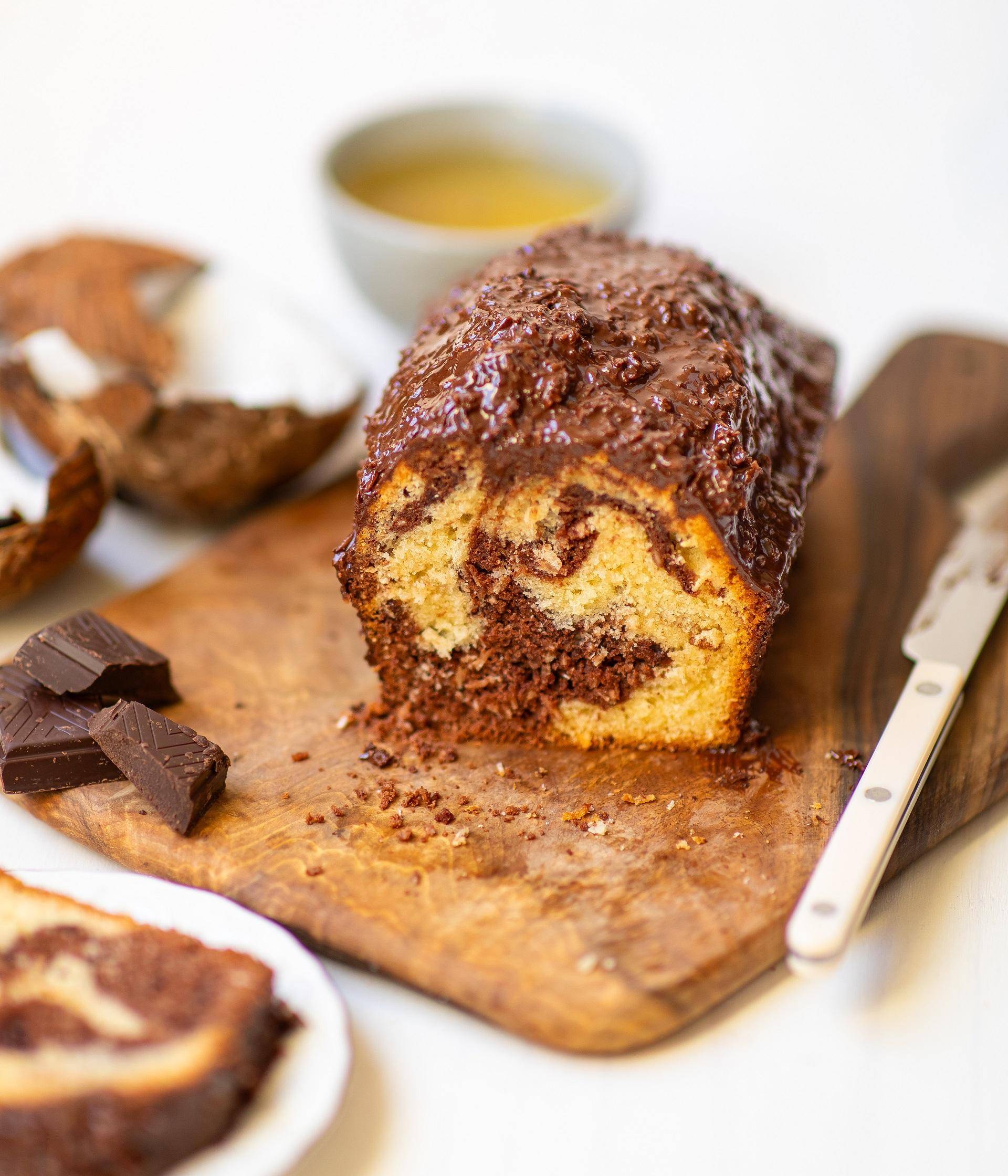 Préparez le glaçage en faisant fondre le chocolat au bain-marie. Une fois fondu et hors du feu, ajoutez l’huile de tournesol et la noix de coco râpée. Laissez tiédir avant de verser le glaçage sur votre gâteau et laisser prendre au frais au moins 1 heure afin que le glaçage fige.