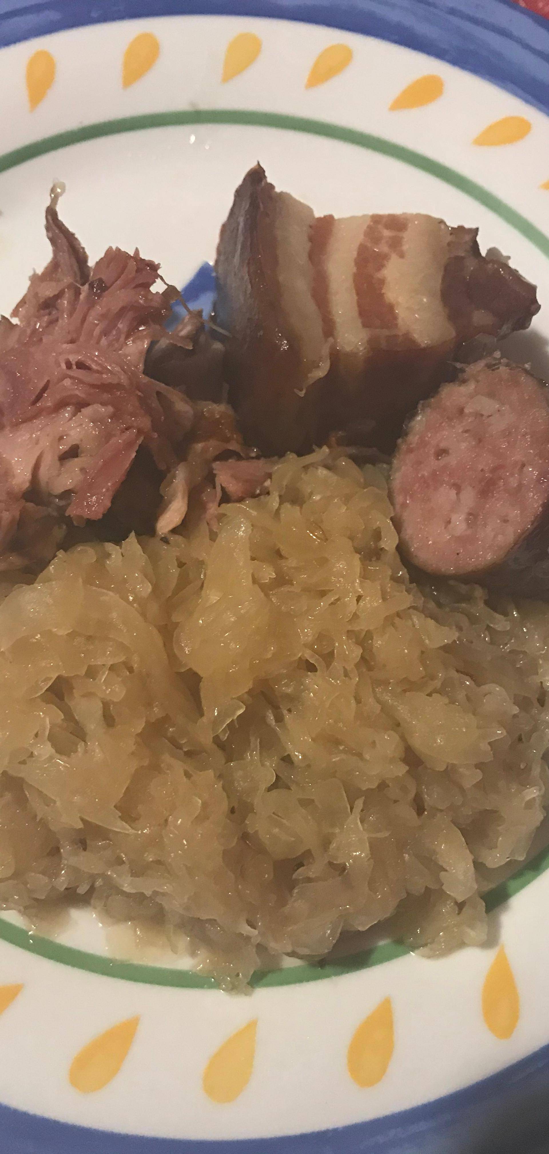 Dans la cuve, poser en formant des étages successifs la moitié de la choucroute, la moitié de la préparation aux oignons mise de côté. Par dessus, poser la palette et la poitrine (photo). Par dessus l’autre moitié de la choucroute puis la préparation aux oignons et enfin les saucisses de Montbeliard.