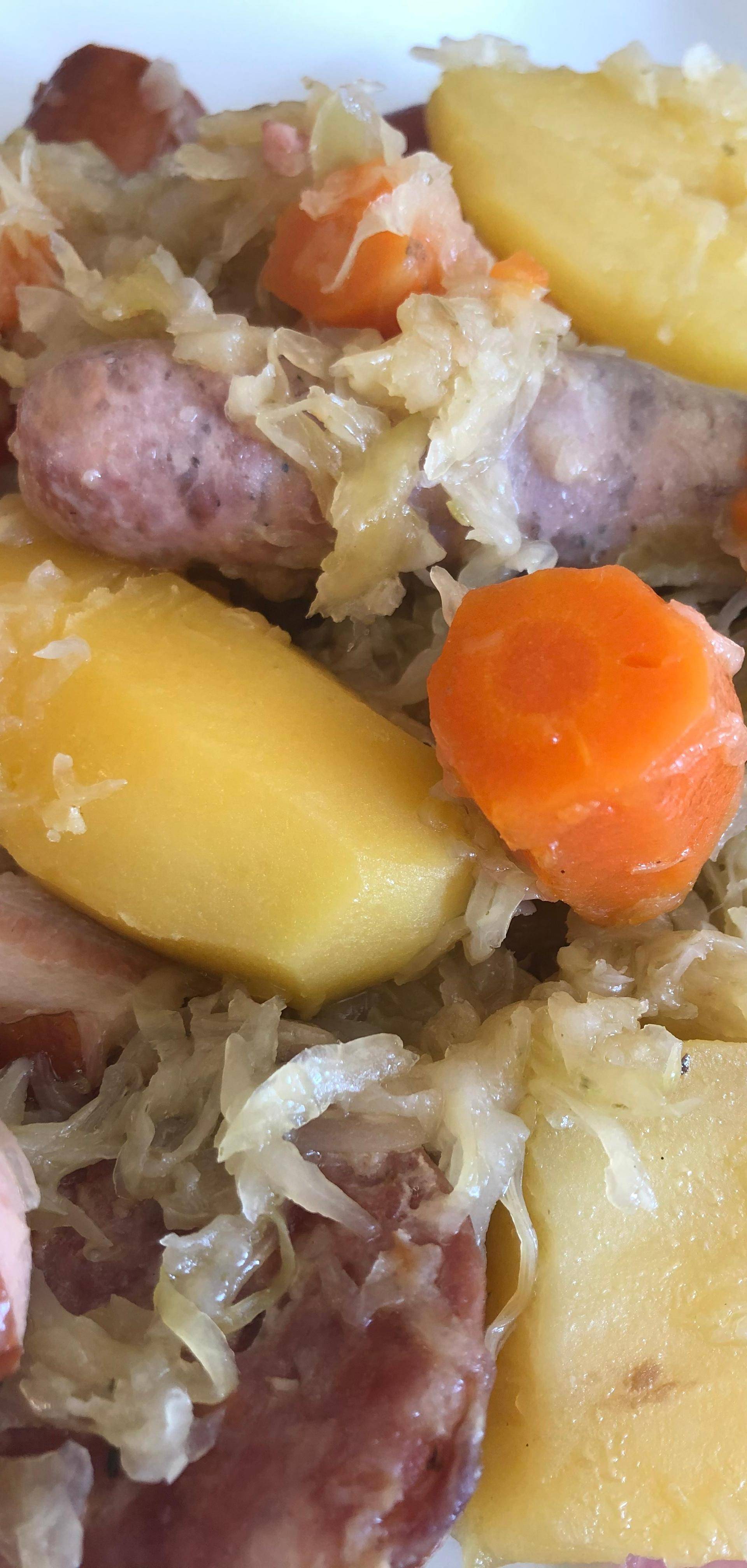 Quand la viande est dorée, rajouter le chou, les chipolatas, les pommes de terre épluchées, les carottes, les baies et les clous de girofle. Recouvrir de bouillon ou de vin blanc. ( ne pas mettre les saucisses fumées alsaciennes car elles sont déjà cuites, elles seront à ajouter à la fin de la cuisson sous pression pour éviter qu’elles n’éclatent)