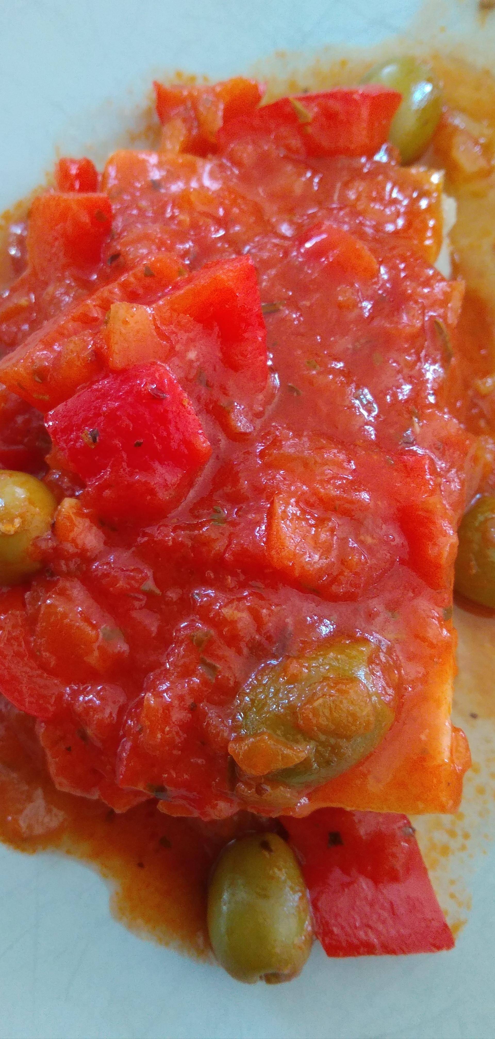 Mettre les tomates concassées, les olives, le poivron coupé en morceaux, le vin blanc, sel, poivre, herbes de Provence et laissez mijoter en P2 pendant 10 minutes