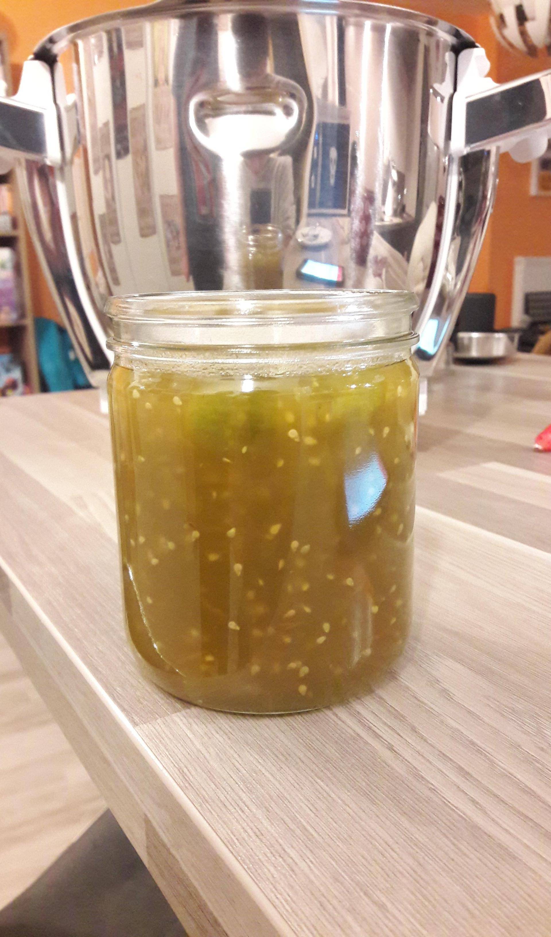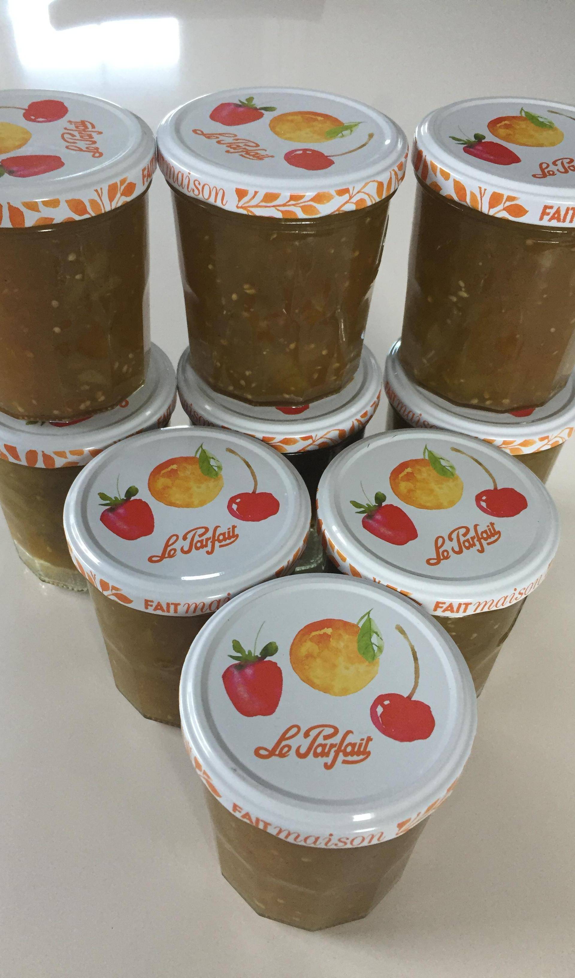 À la fin, remplissez immédiatement les pots de confiture préalablement stérilisés et retournez-les quelques minutes. Pour information, il est attendu que ce soit toujours liquide en sortie de cuisson, avec l’agar-agar, la confiture ne « prend » qu’en refroidissant.