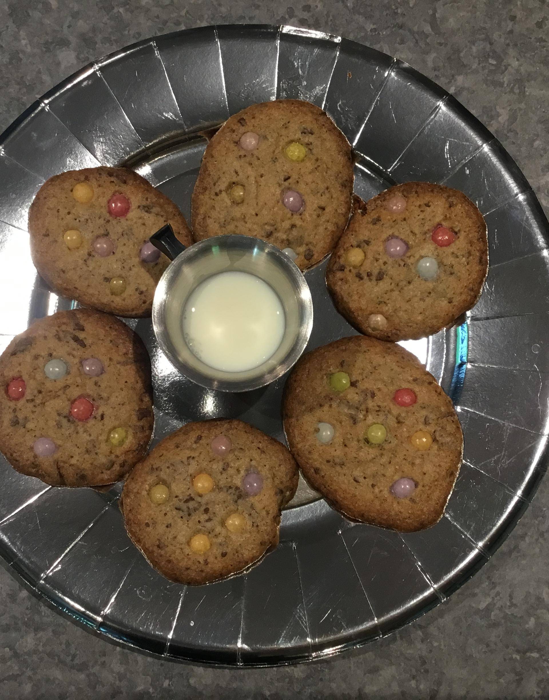 Recouvrir la plaque du four de papier sulfurisé (à changer à chaque fournée). Avec 2 cuillères à café, prélever des noix de pâte et les façonner en boulettes. A espacer suffisamment pour éviter que les cookies fusionnent. Aplatir les boulettes avec les minis Smarties - j’en mets 6 par cookie, nombre comme chacun préfère 😉 Cuisson : 15 minutes par plaque. Pour une meilleure cuisson, ne mettre qu’une plaque à la fois. Puis laisser refroidir. Conseil de conservation : mettre les cookies dans une boîte hermétique, séparer les niveaux en réutilisant le papier sulfurisé. On peut les garder ainsi jusqu’à 1 mois 1/2.