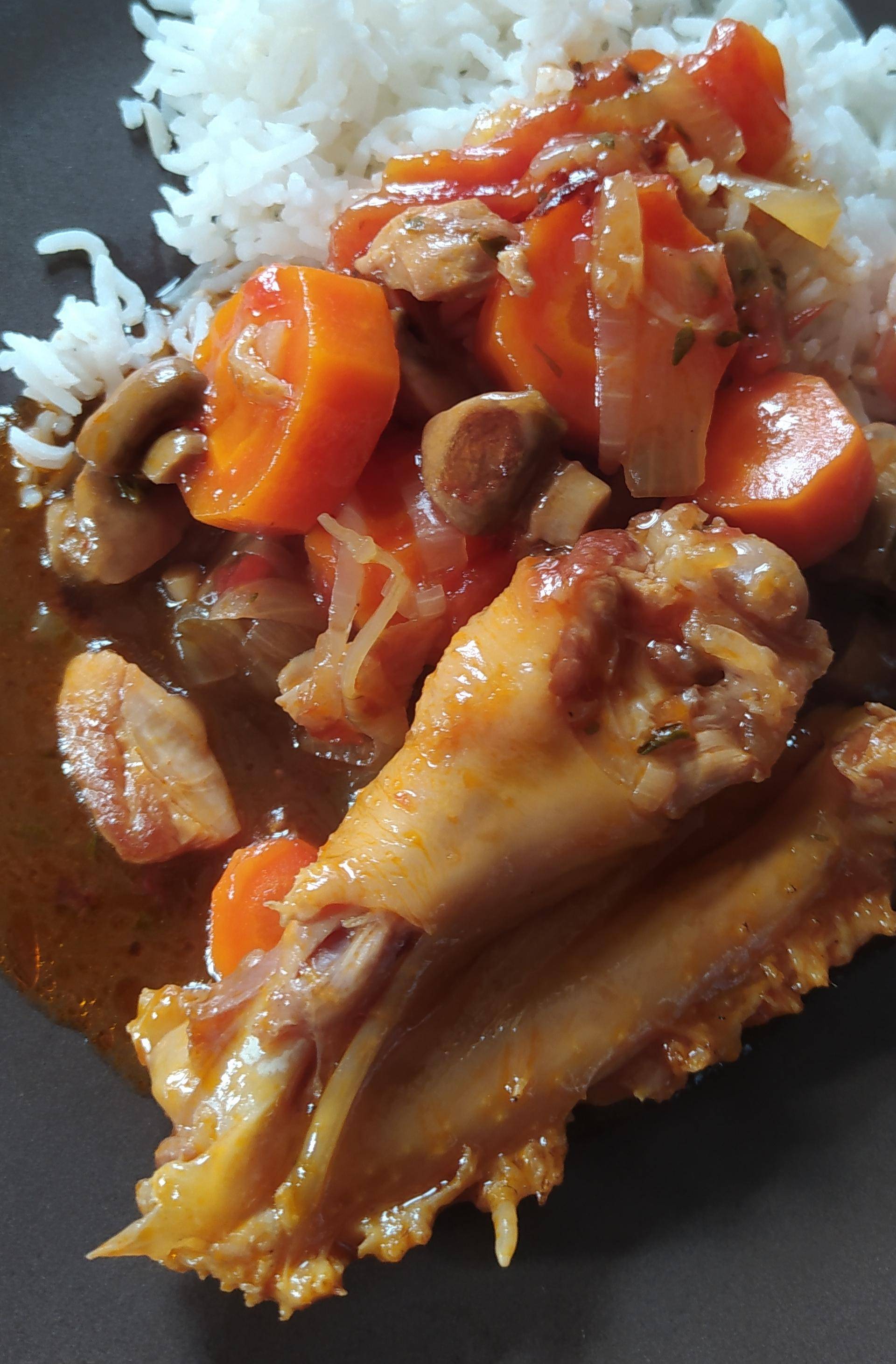 Découper le poulet en morceaux , éplucher l'ail,émincer les échalotes, oignons ,champignons ,éplucher les carottes et les couper en rondelles ...