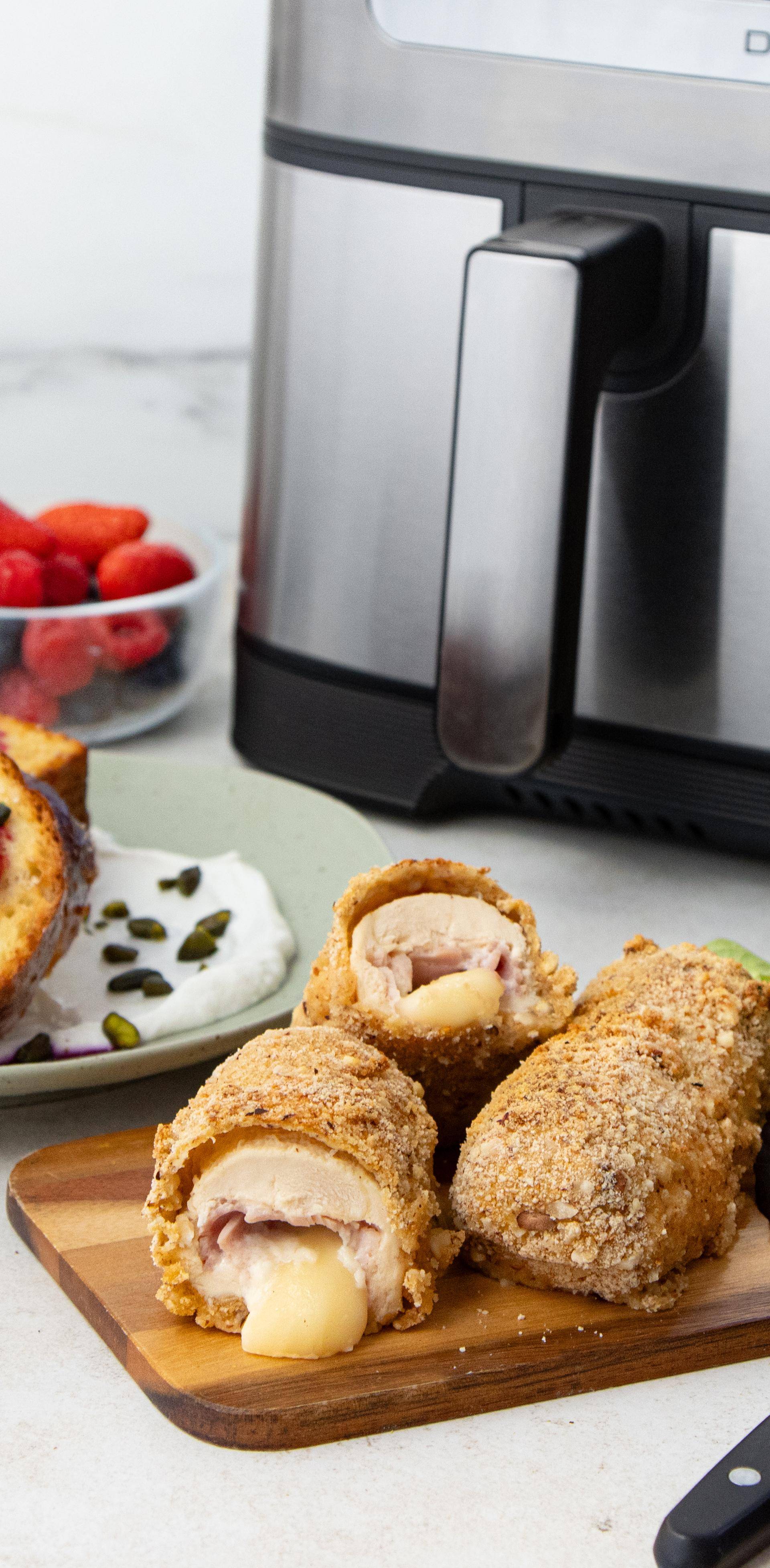 Allumez l'appareil. Activez le tiroir 2. Sélectionnez le programme FRITES à 180 °C pendant 20 min. Déposez les cordons bleu , arrosez d’un filet d’huile d’olive. Retournez-les à mi cuisson. Activez le tiroir 1. Sélectionnez le programme MANUAL à 180 °C pendant 7 min. Ajoutez les tranches de brioches. 2 minutes avant la fin de la cuisson, ajoutez les fruits rouges afin qu'ils compotent légèrement.