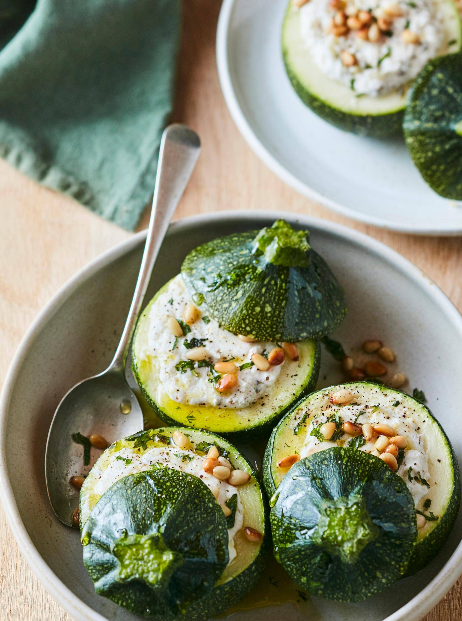 Parsemez de pignons de pin et de menthe fraîche ciselée et servez les courgettes recouvertes de leur chapeau. Accompagnez de riz ou de boulgour arrosé du jus de cuisson.