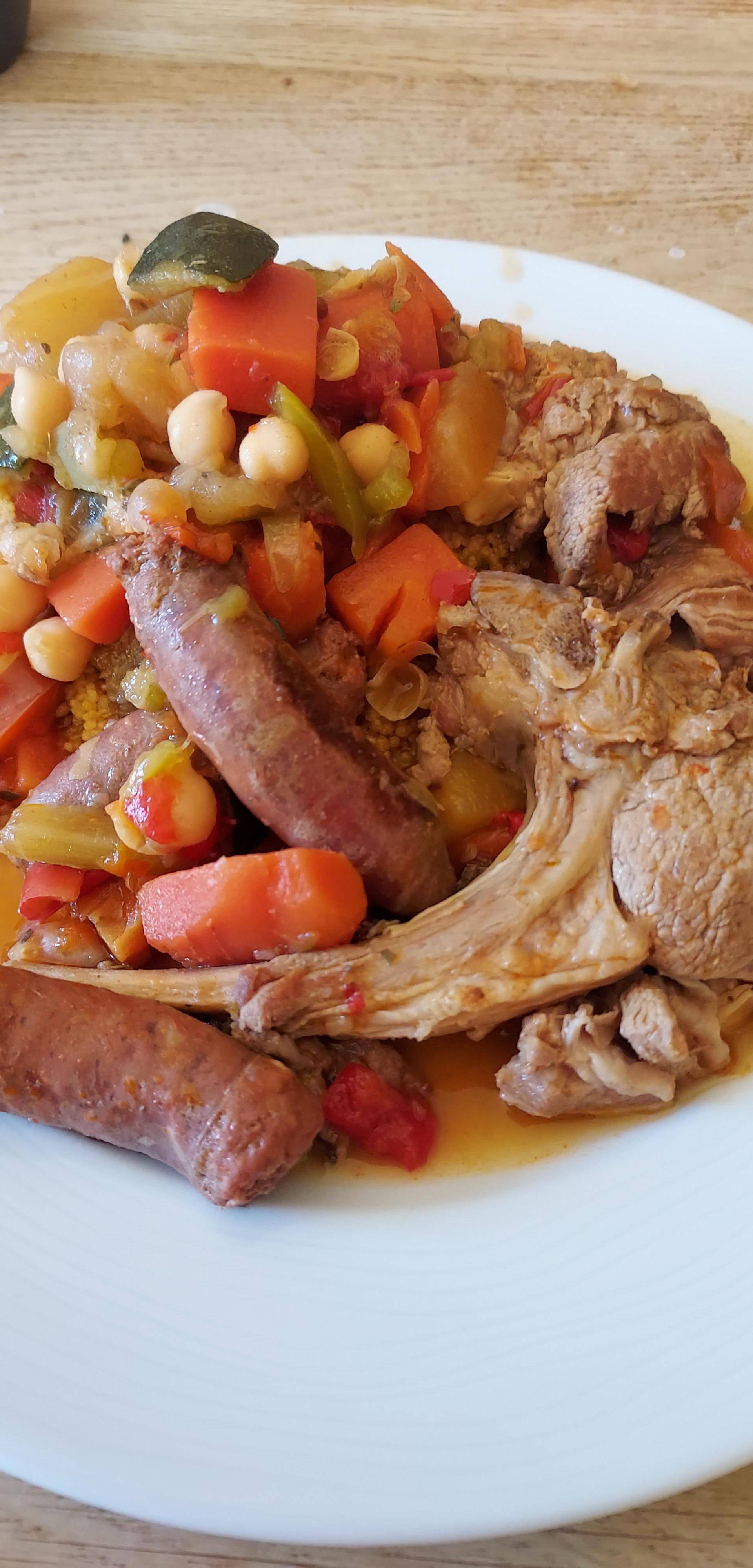 A la fin de la cuisson, mettre la semoule dans un saladier, prélevez 2 belles louches de jus dans le bol du robot, et versez ce jus sur la semoule. Mélangez à la fourchette et laisser gonfler quelques minutes.