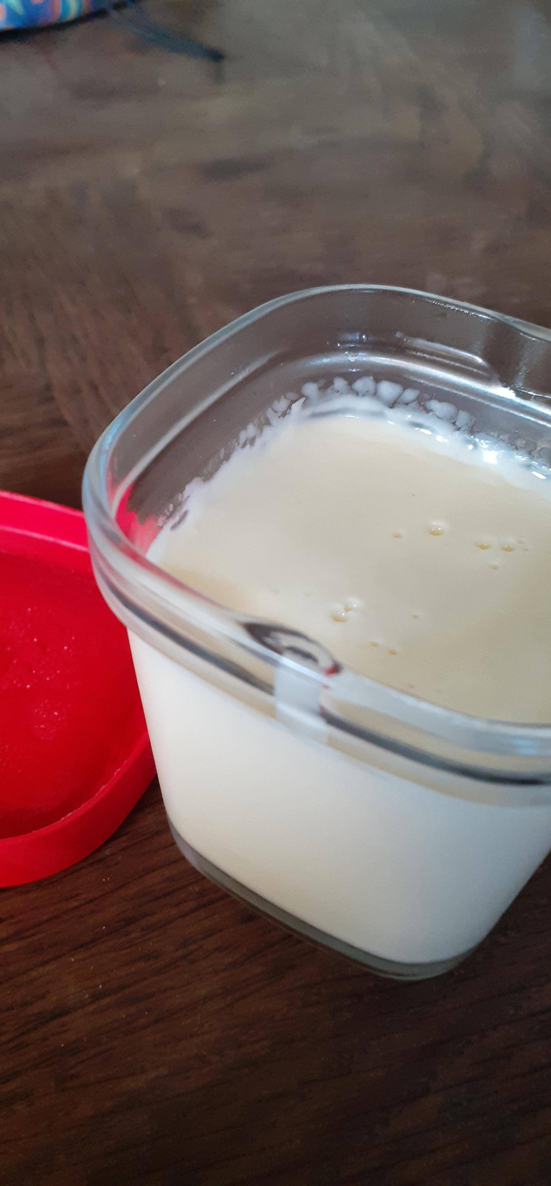 Mettre dans des pots et réserver au réfrigérateur. Si la consistance vous paraît trop liquide vous pouvez rajouter de la maïzena diluée dans un peu de lait froid et relancer le programme 1minutes. Garder en tête que la crème va épaissir au frigo même si elle semble liquide. ( Je conseille de les mettre une nuit au frais )