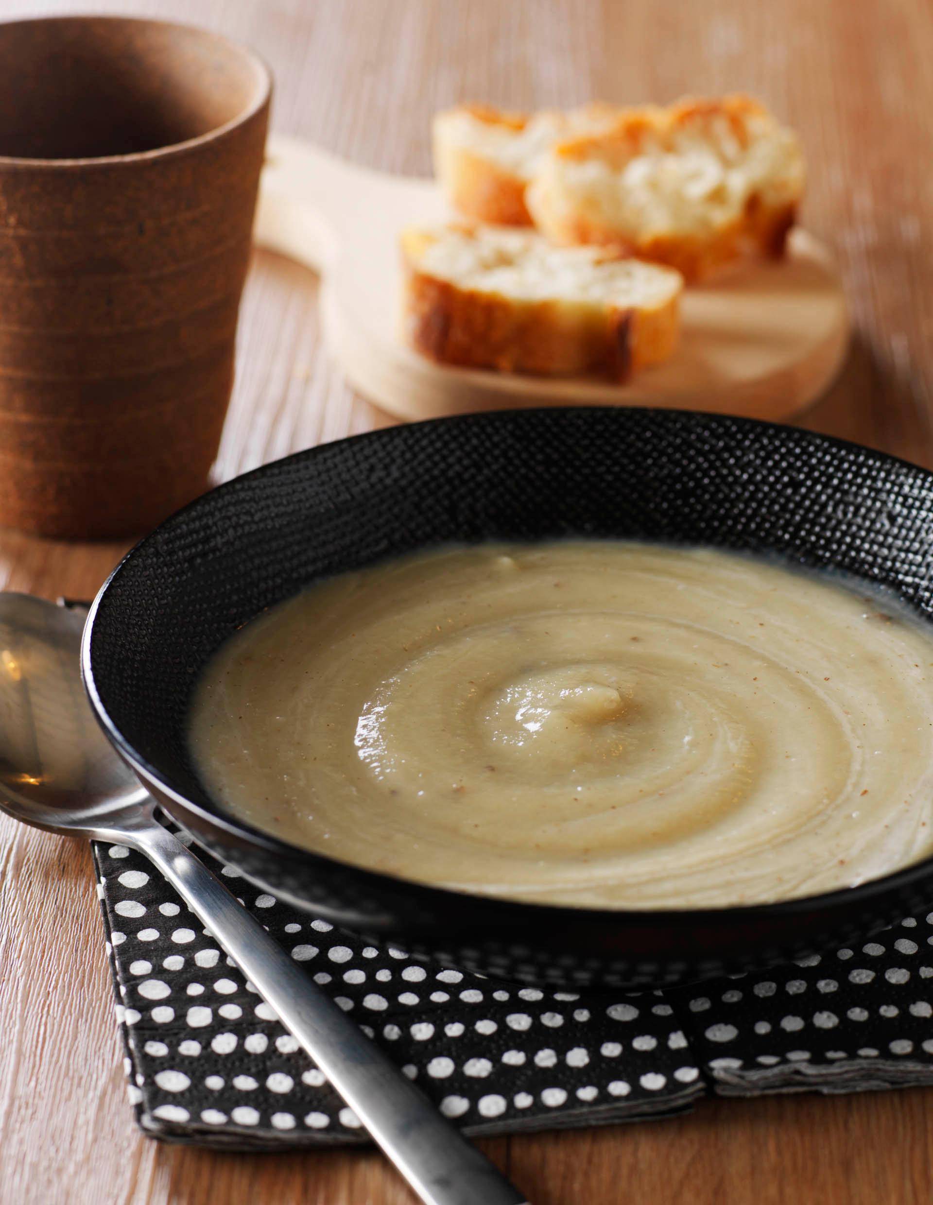 Dans le bol du robot muni du couteau hachoir Ultrablade, mettez le cube de bouillon, les topinambours coupés grossièrement, le poireau et le céleri coupés en tronçons.