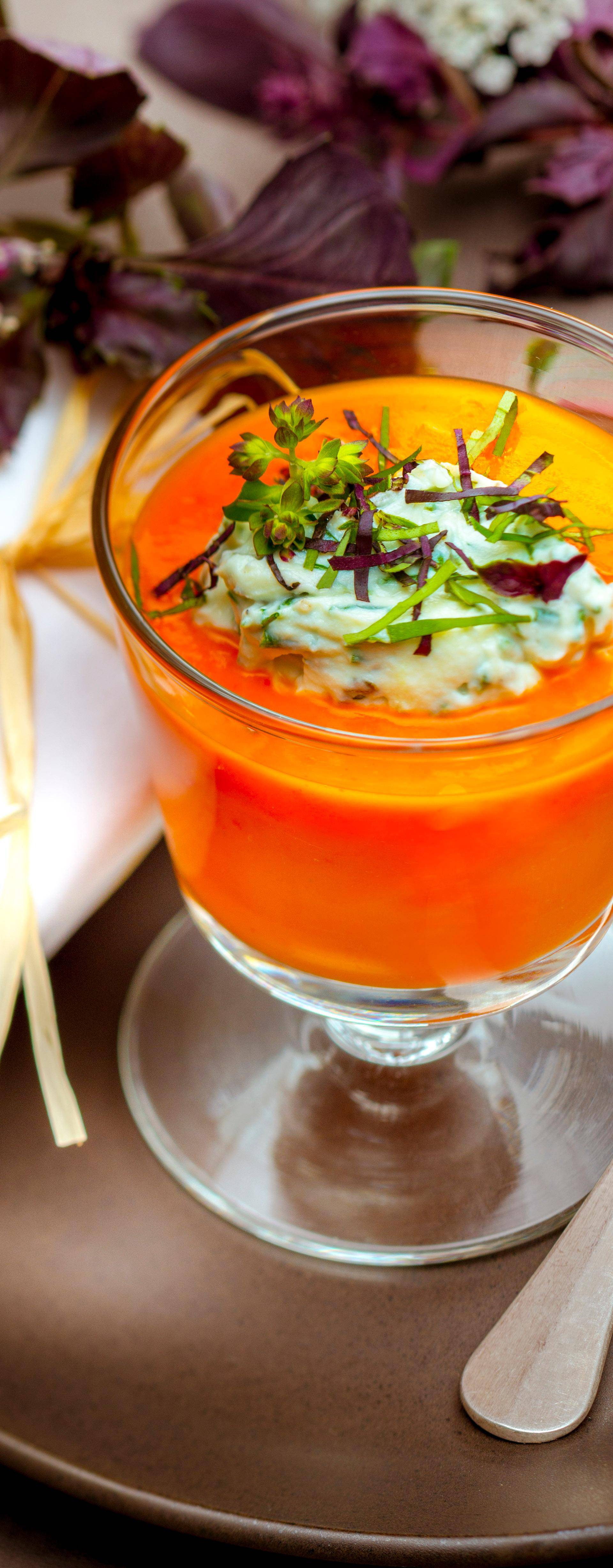 Crème mousseuse de poivron rouge, ricotta aux herbes