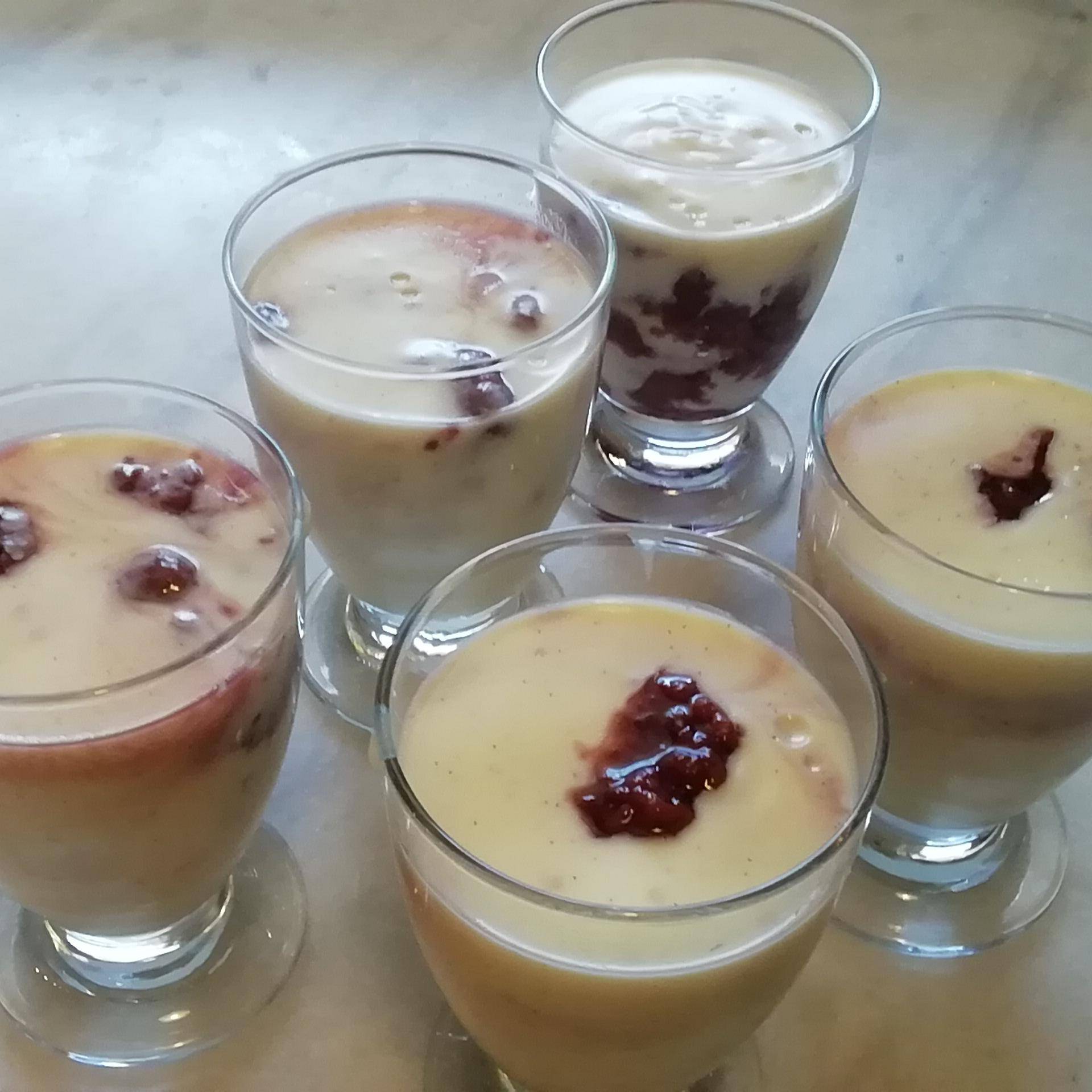 Répartir les framboises dans 5 ramequins et verser la crème dessus. Laisser refroidir au réfrigérateur au moins 2 heures.