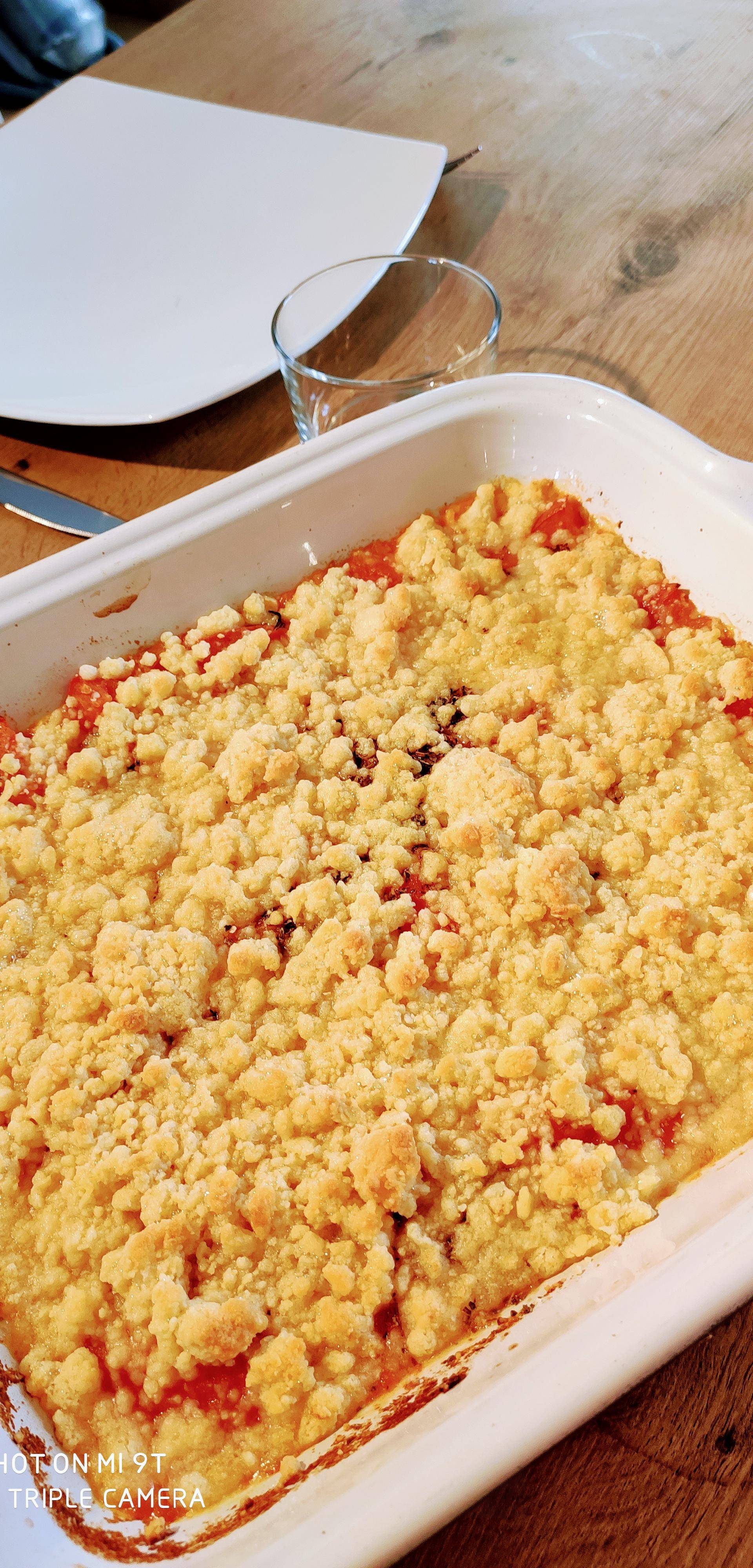 Saupoudrer le plat de la pâte a crumble. Mettre au four 10 min a 200oC.