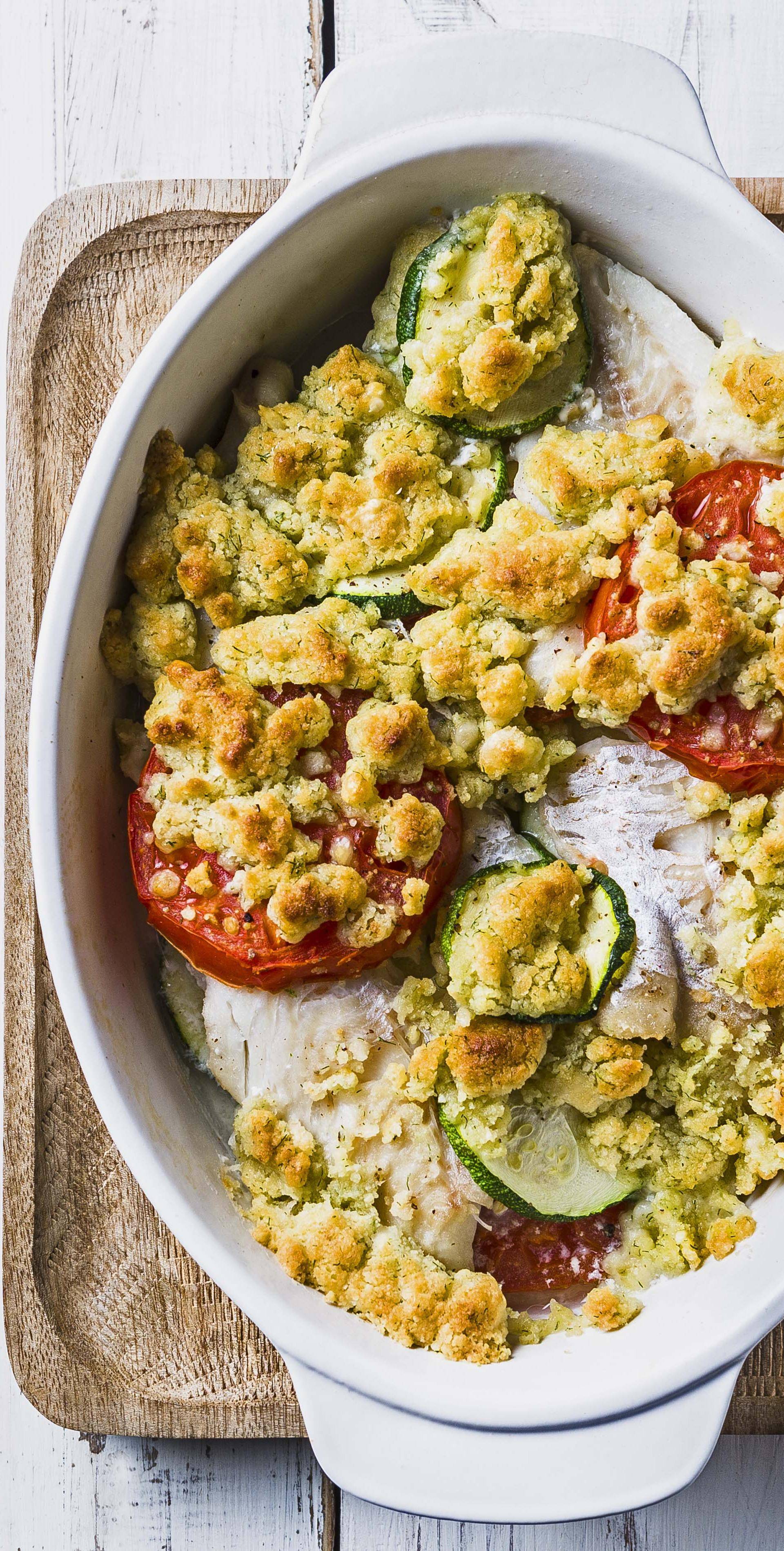 Couper la tomate et la courgette en fines rondelles. Dans un petit plat à four, alterner les légumes et les filets de poisson en salant et poivrant entre chaque couche.