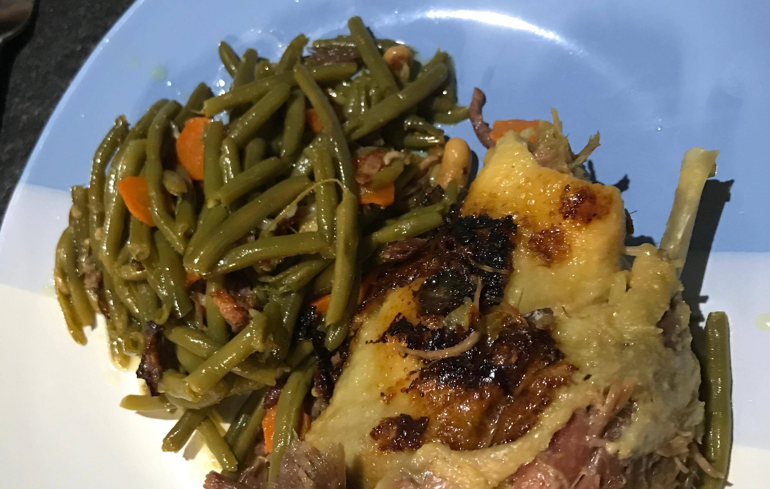 2 càs de graisse de canard Faire dorer 3 mn les cuisses dans la graisse de canard de chaque côté Déposer les lardons et laisser dorer 3 mn Avec 1/2 oignon émincé Preparer l’autre 1/2 oignon en le piquant de clous de girofles Ajouter la carotte finement coupée et 1 mn de dorage