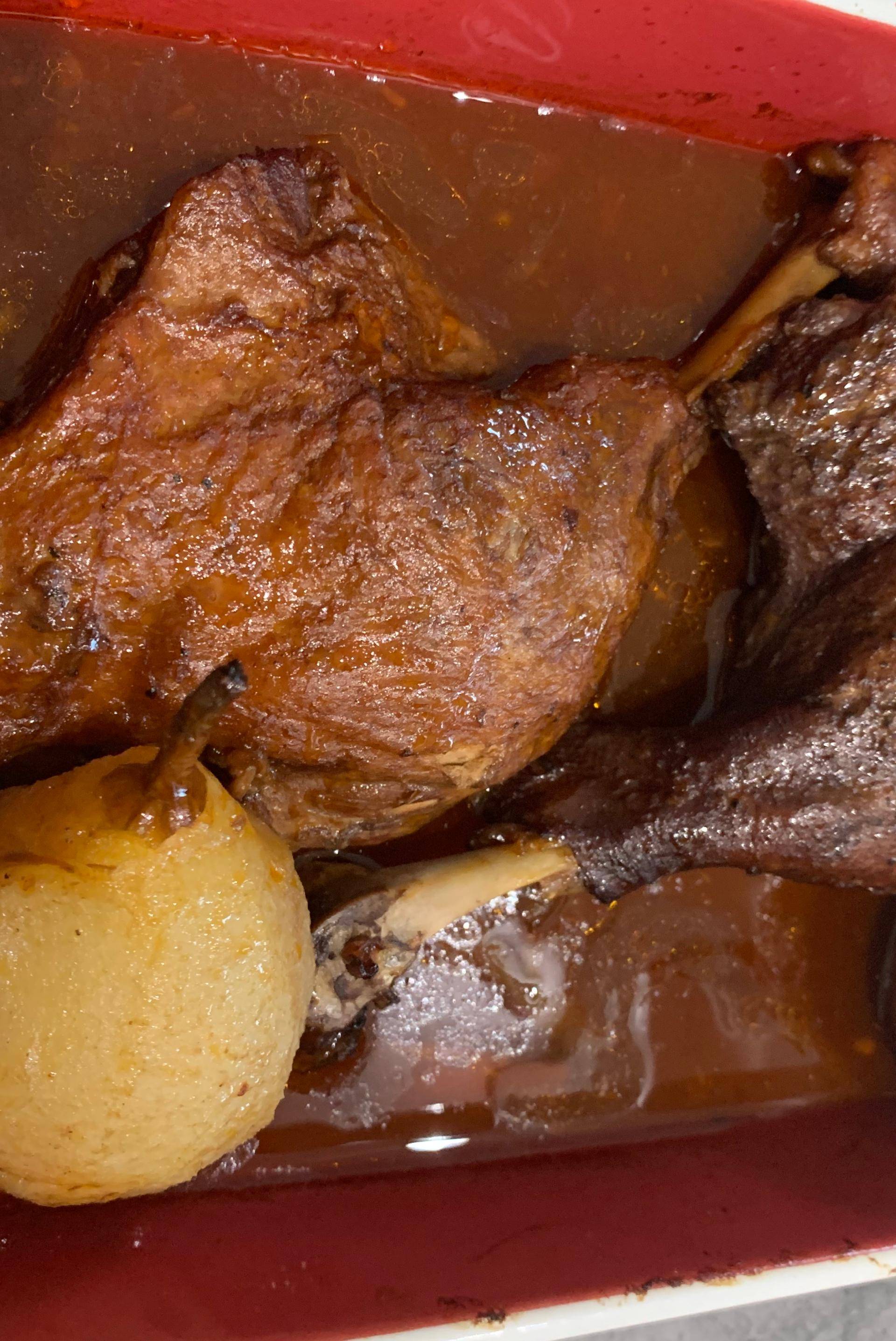 Dans la cuve rajouter les 25 cl d’eau 20 cl de vin rouge pour moi de Bordeaux 5 cl de cognac ou Armagnac l’ail le sel le poivre des épices 4 épices. Cuire sous pression 1 heure