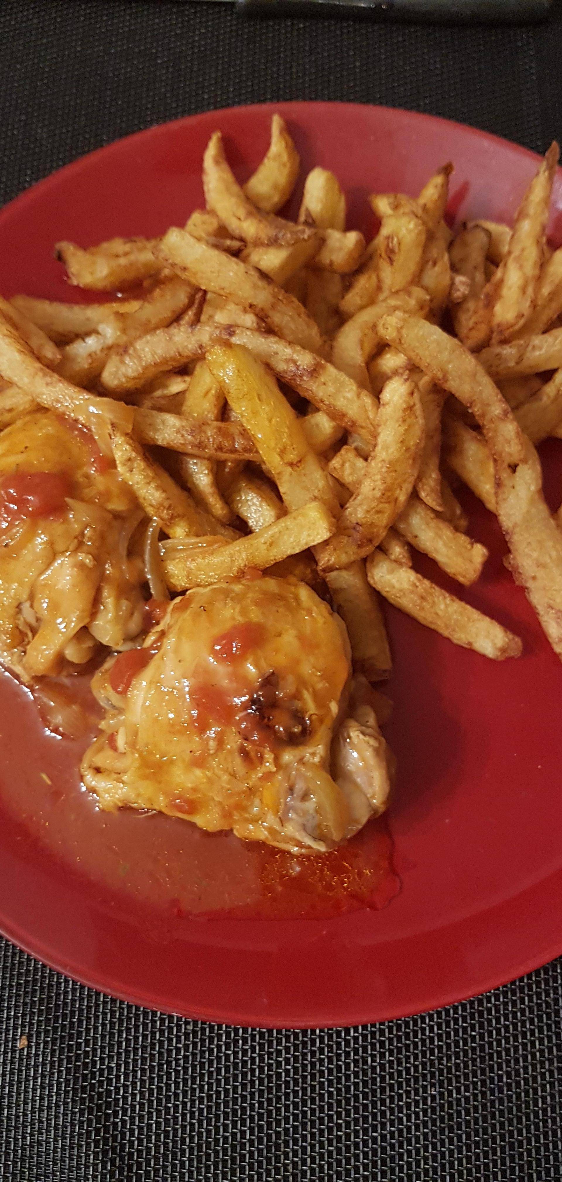 Ajouter les cuisses de poulet, le fond de veau, le ketchup, les herbes de Provence et l'eau, une pincée de sel et de poivre. Mettre en cuisson sous pression 16mn