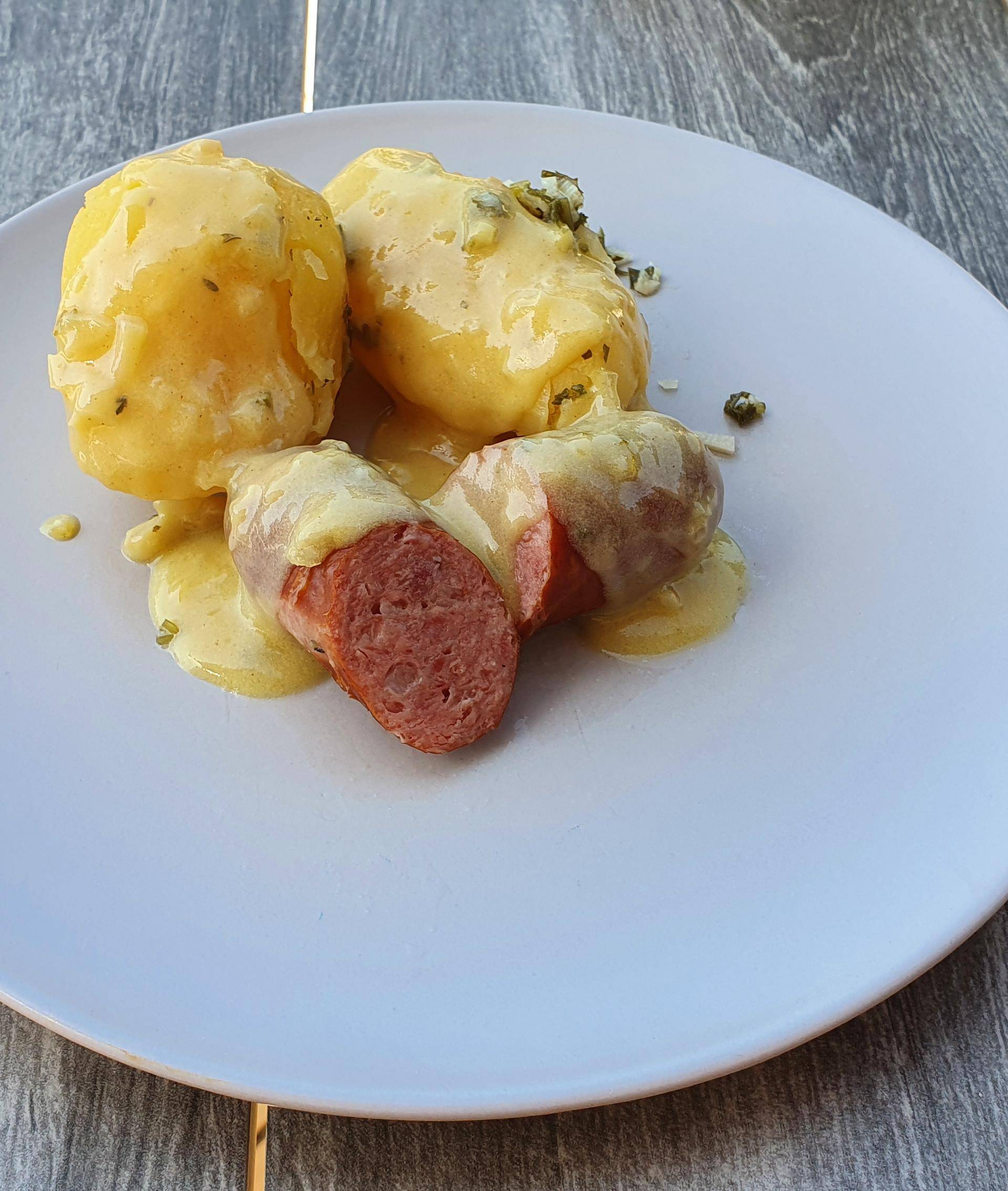 Éplucher et émincer l’oignon et l’ail, pelez les pommes de terre et coupez les en 4. Taillez les diots en trois